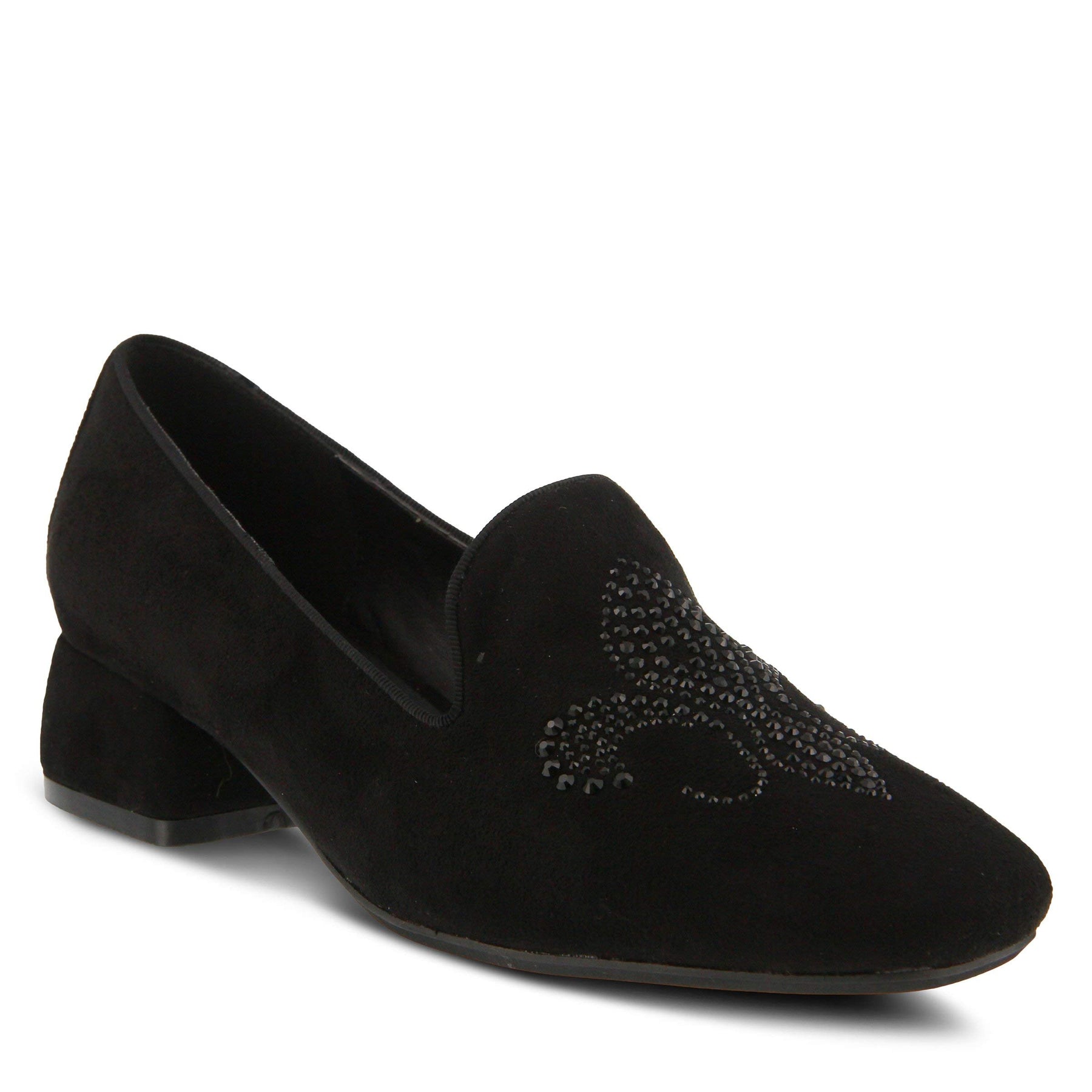 European inspired, synthetic suede fashion loafer featuring a rhinestone fleur de lis design.