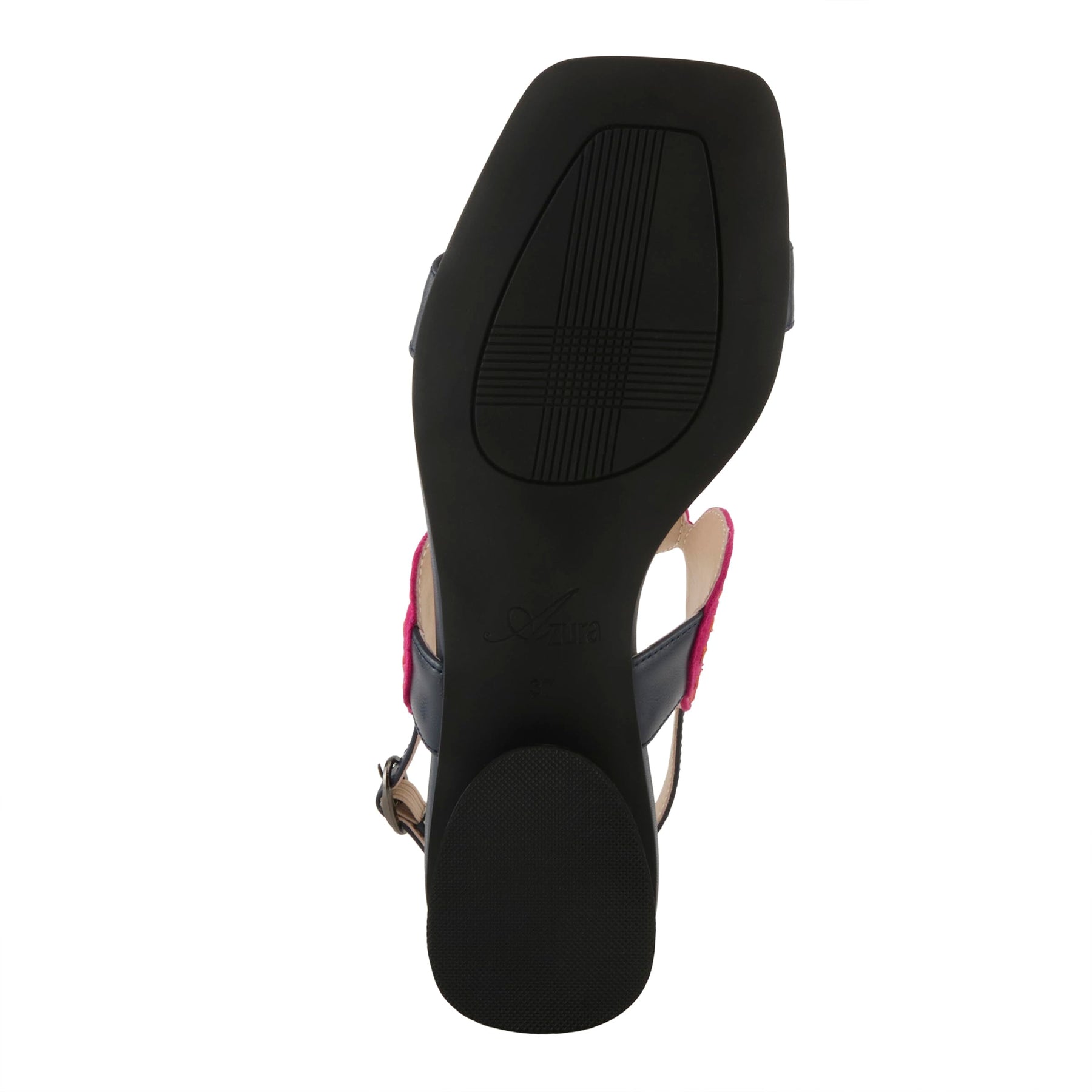 Infuse your wardrobe with vibrant style and comfort with the Azura Women's BROIDER Buckle Sandals. Featuring a leather and textile upper, these sandals showcase a modern square toe design and a trendy dimensional low heel. The slingback style with a functional buckle and stretchy gore ensures a secure and adjustable fit. With a soft, cushioned leather footbed, the BROIDER offers all-day comfort while adding a sophisticated flair to any outfit. Whether paired with a sundress or summer shorts, these sandals are your go-to choice for effortless warm-weather style.