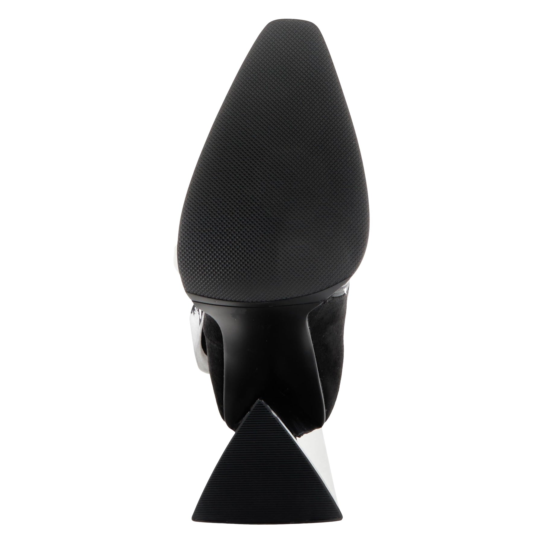AZURA Style: Ettajay Yes- they'll be staring. Who could blame them? Super cool, and classically twisted lightweight oversized ankle chained knee high boots in our softest velvety smooth microsuede. Gently pointed on a snip toe welt with a killer mirrored triangular heel. Upper: Microsuede Lining: Microsuede, Synthetic Insole: Microsuede, Synthetic Outsole: Rubber Closure: Zipper Heel Height: 3 3/4" Shaft Height: 19 1/2" Circumference: 13 1/2" Features: - Padded Insole, Premium, Vegan Friendly