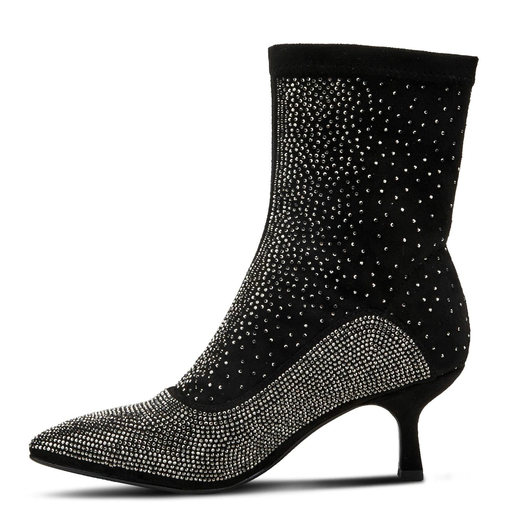 Azura Style: Glioris Is a sparkly twinkling fun mix of Glinda the good witch meets sultry siren Morticia. Crystal micro-suede pull-on with a curvy sexy kitten heel and glittery pointed toe. Wear pulled up and loose or fold under and over for shorter cuffed bootie. Either way, this celestrial meteor shower for your feet will dazzle even in the darkest of nights. Heel: 2 3/4" Boot shaft: 6 3/4" Boot circum.: 10" Features: - Upper: Micro suede - Upper Finishing: Metallic - Heel type: Kitten, Flare - Lining: Textile - Insole: Synthetic - Outsole: Rubber - Toe type: Pointed toe, Closed toe - Pattern: Graphic, Textured - Accents: Rhinestones - Closure: Slip-on - Features: Comfort, Premium, Stretchable, Textured