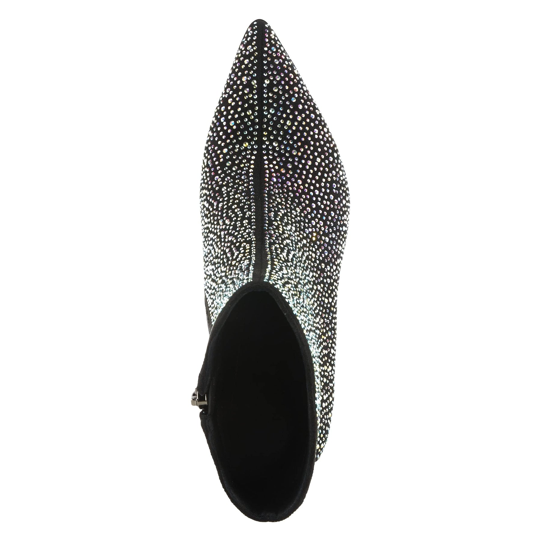 AZURA Style: Sparks A background so black that all-over large and small crystals feel like they are moving across this entire bootie like the meteor shower one can only dream about! A covered heel to match, a sexy curvy solid black collar, center seam and inside zipper for stop in your tracks fabulousness. Upper: Microsuede, Rhinestone, Glitter Lining: Textile Insole: Textile Outsole: Rubber Closure: Zipper Heel Height: 3" Shaft Height: 7 1/2" Circumference: 9 1/2" Features: - Padded Insole, Premium