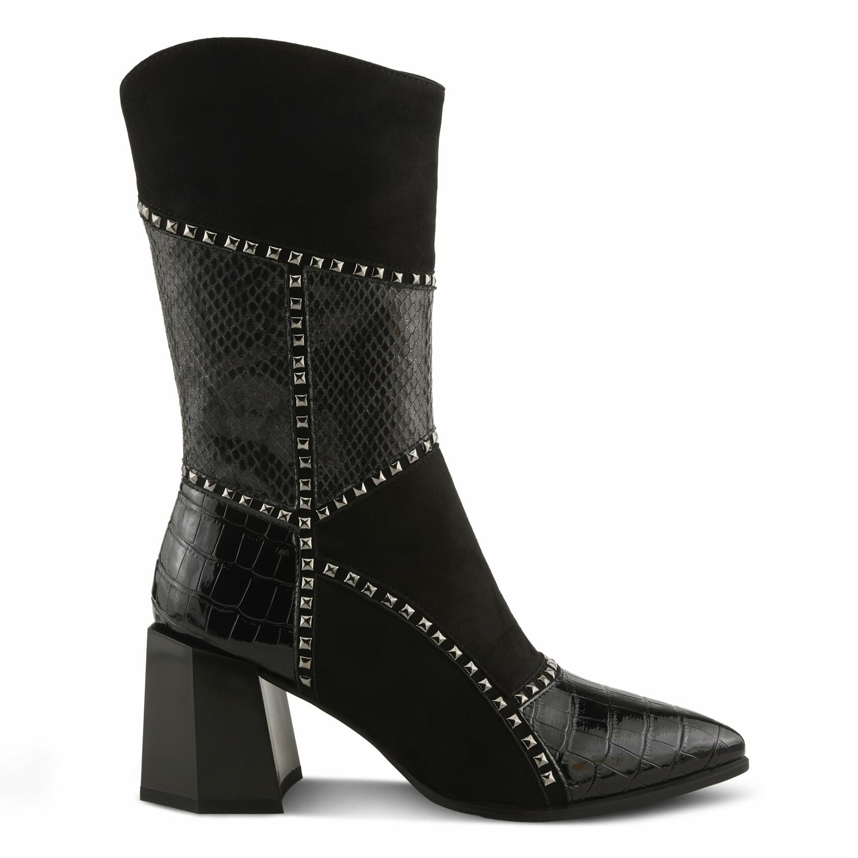 Fierce Style with Azura ZAYRINA Boots - These boots feature a combination of textures and prints for a powerful look. Perfect for making a statement. Key Features: Upper: Leather Combo, Lining: Faux Fur, Insole: Faux Fur, Outsole: Rubber, Closure: Zipper, Heel Height: 2 3/4", Shaft Height: 11 3/4", Circumference: 11 1/2". Mix of materials and animal prints, stud details, and an extended chunky heel.