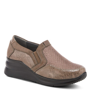 Flexus Style: ALBOKA Showstopping shoe starring beautiful tonal snakeskin-inspired textile and stunning tonal crystals all on a slight wedge all-day wear outsole. Upper: Microsuede, Synthetic Lining: Synthetic Insole: Synthetic Outsole: Polyurethane Heel Height: 1 7/8" Platform Height: 3/4" Shaft Height: 2 7/8" Circumference: - Features: - Comfort, Elastic, Flexible Sole, Padded Insole, Removable Insole, Vegan Friendly