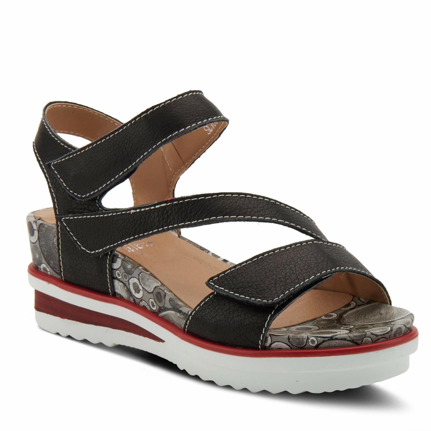 French inspired, premium leather asymetrical sandal featuring a total custom fit design with three (3) adjustable hook and loop straps and tonal stitchwork all on a leather-wrapped, comfort wedge with a platform. Sandalia asimtrica de piel de primera calidad de inspiracin francesa, con un diseo de ajuste personalizado total con tres (3) correas ajustables de gancho y bucle y puntadas tonales, todo en una cua cmoda y envuelta en piel con plataforma.