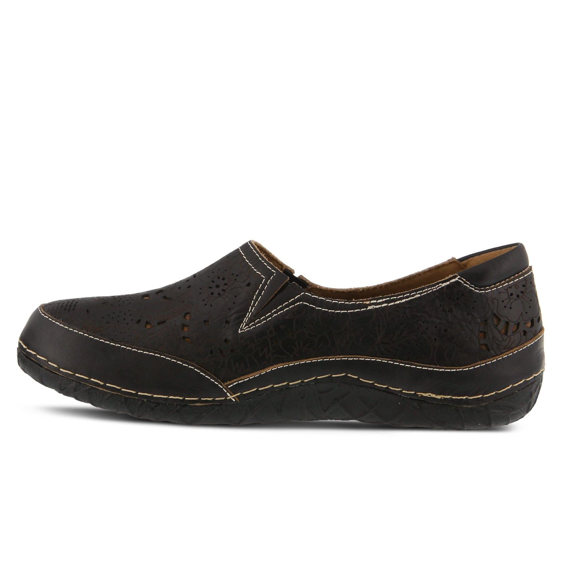 French inspired, hand painted leather loafer featuring flower perforated design and covered elastic goring