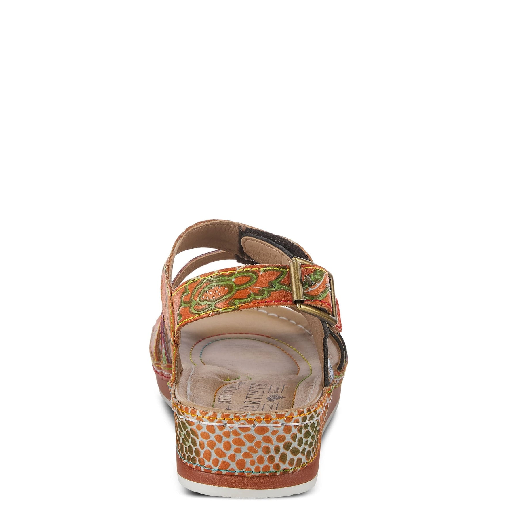 French inspired design, hand painted leather sandal featuring unique color blocking and fashioned with a metal flower button.