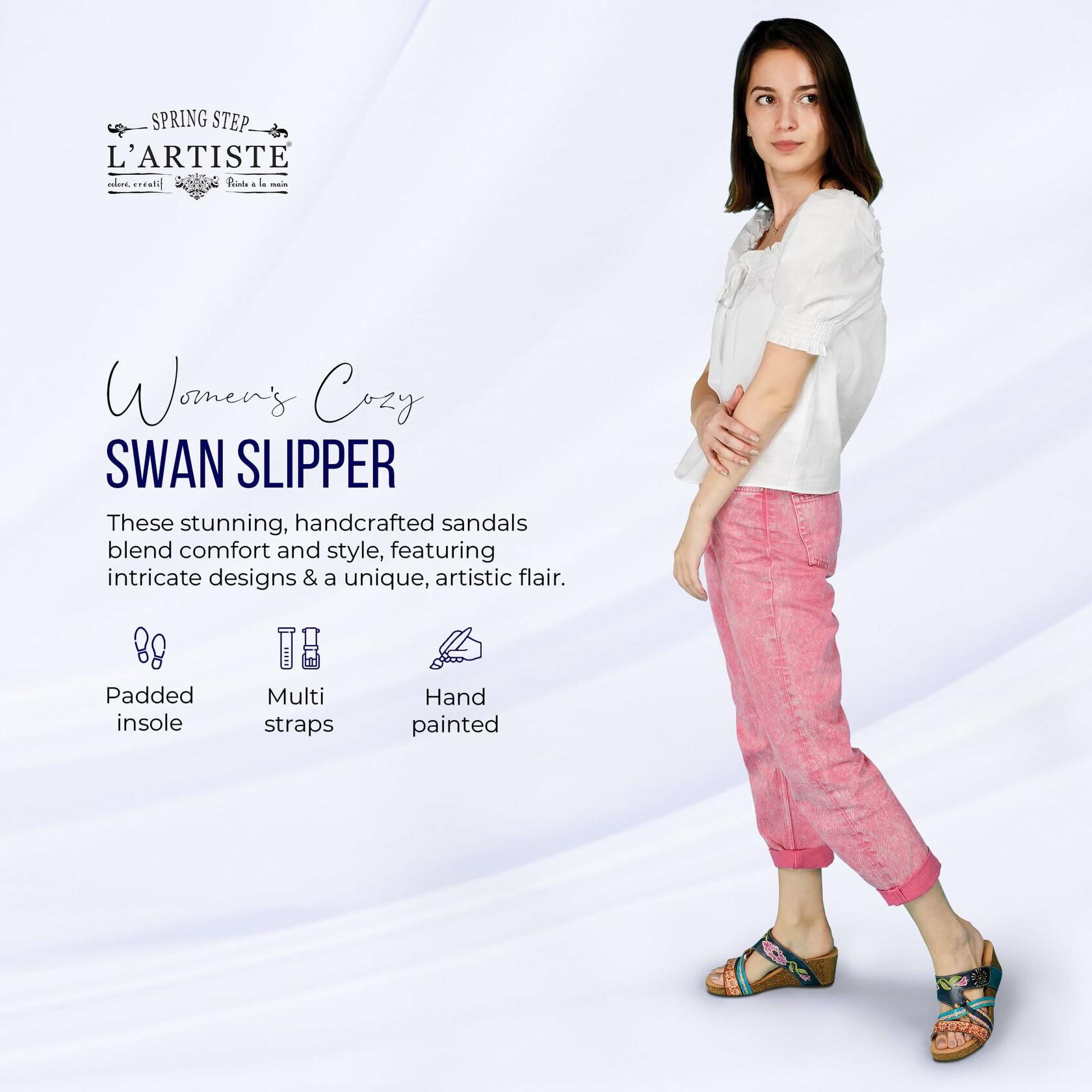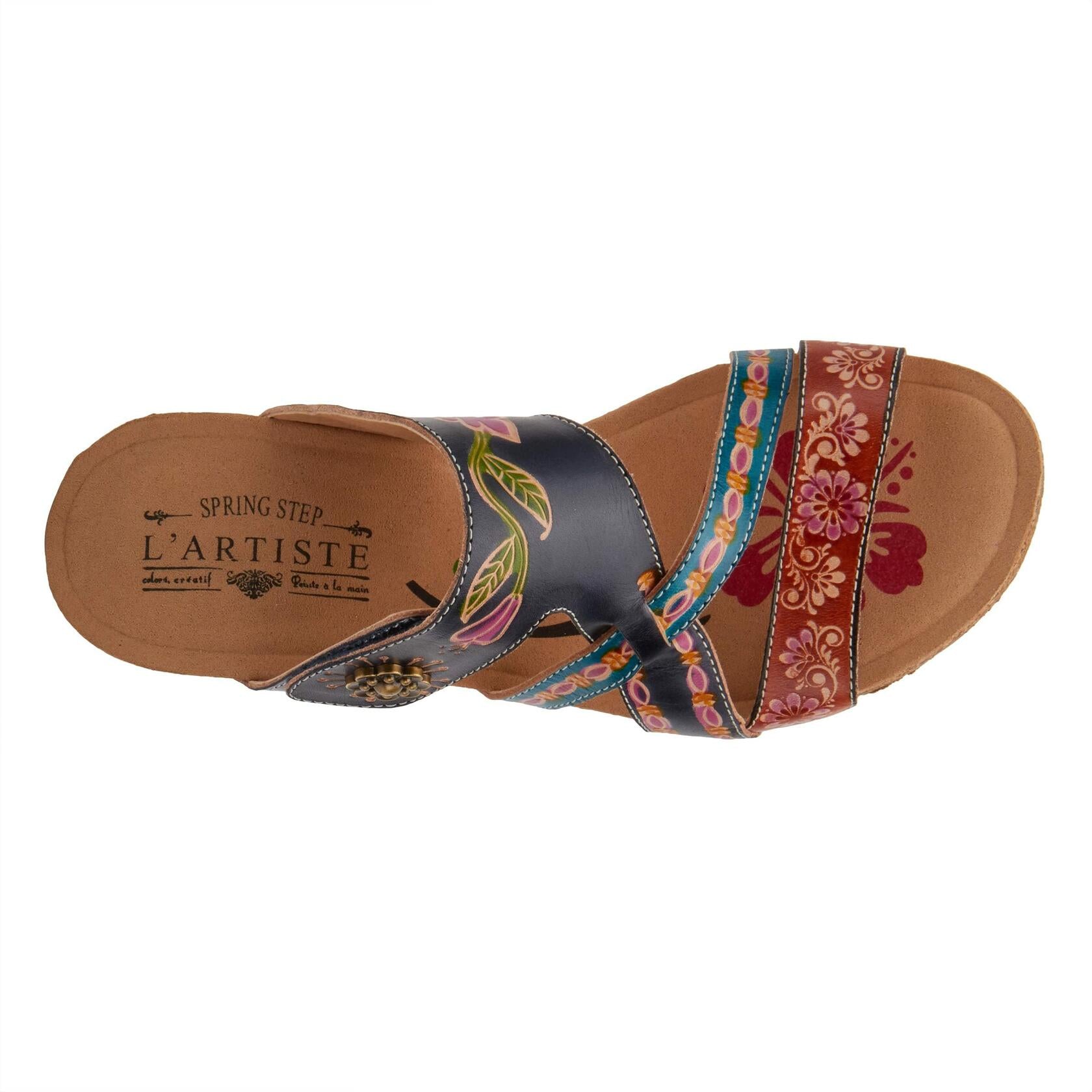 Description French inspired, beautiful hand-painted premium leather multi strap slide sandal featuring a floral embossed pattern, tonal sitichwork, and an adjustable hook and loop instep straps all on a cork-infused, comfort wedge with a platform.