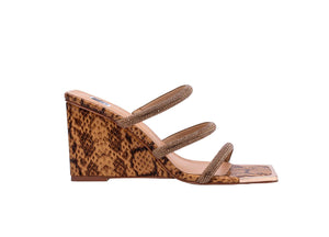 Square-jewelled buckle adorns our satin, square-toe slide. A one-inch fashionable circular heel is studded with stones of varying size.