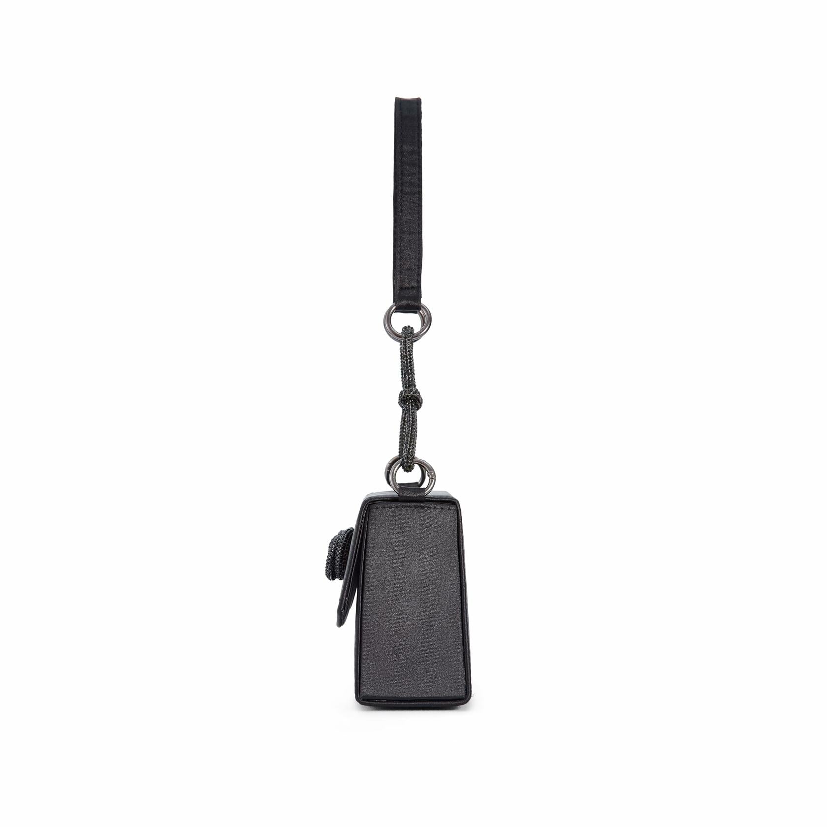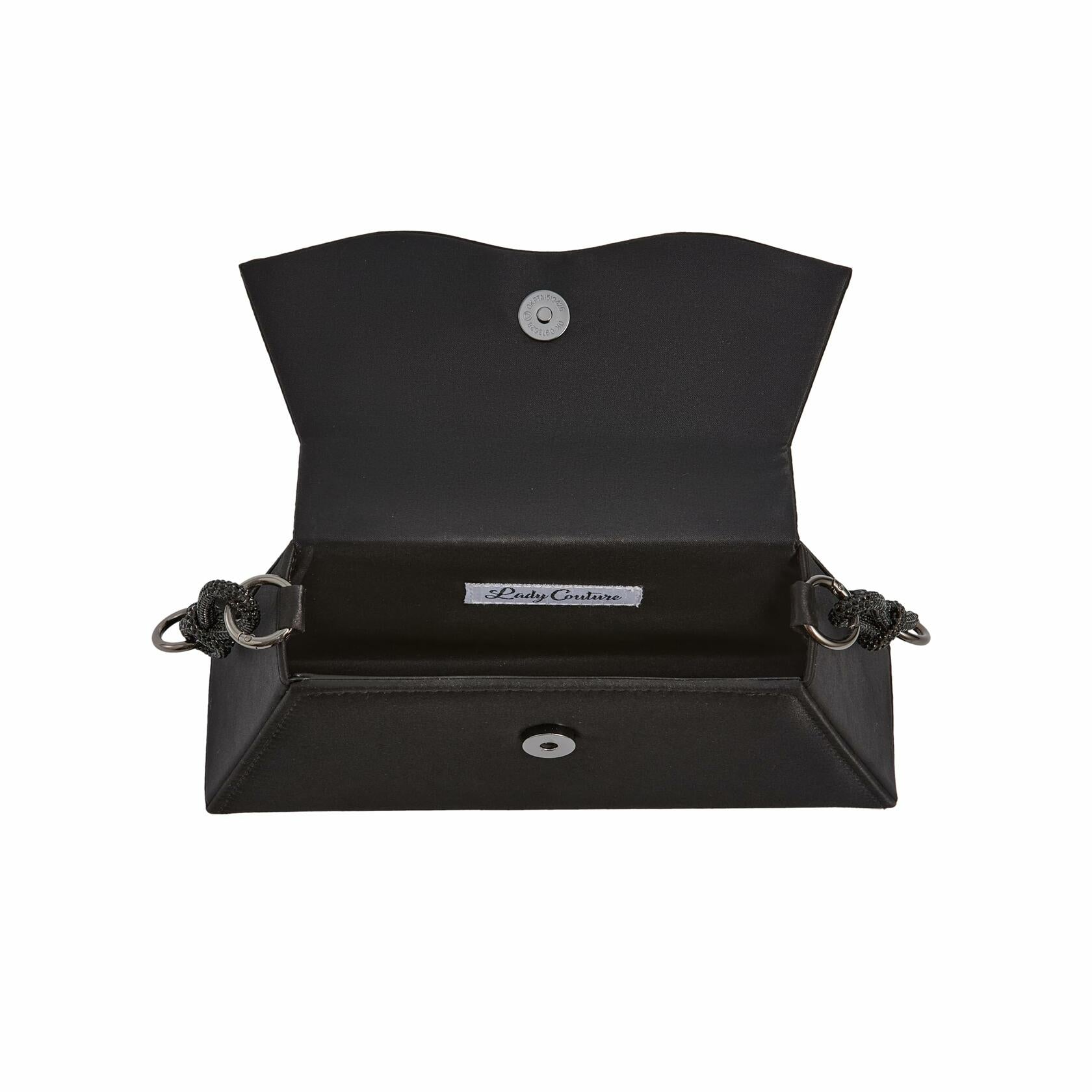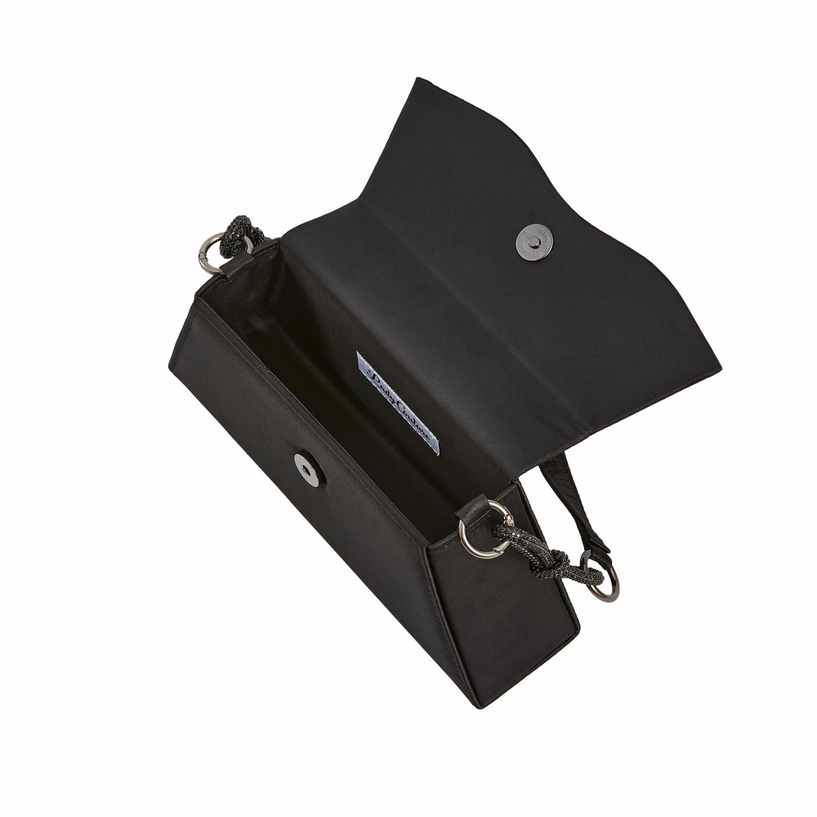 Make a statement with this squared-off trapezoid-shaped hard bag. The scalloped flap closure is adorned with a dazzling rhinestone-covered bow, which is also incorporated into the shoulder strap for a cohesive look. Perfect for any special occasion, this bag combines elegance and functionality. Dimensions 10 x 5 x 2.5 inches.