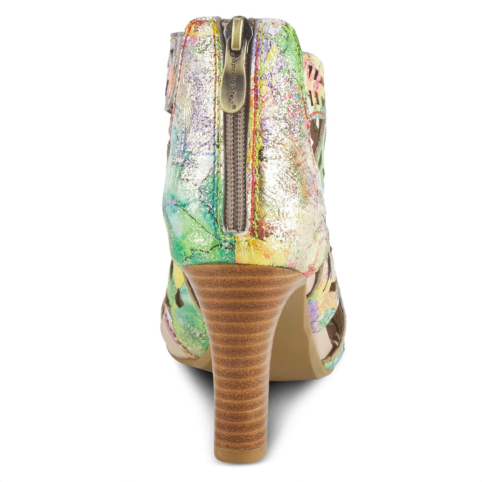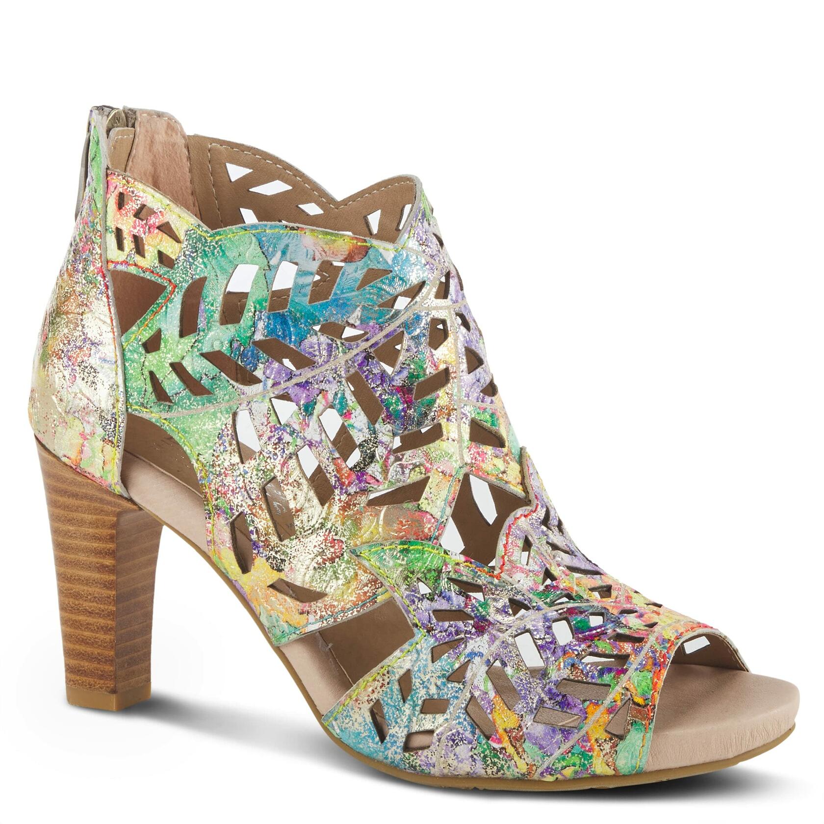 L'Artiste Style: Amora French inspired design, hand painted leather peep toe laser-cut sandal. Heel Height (approximately): 3 1/4" stacked, Platform Height: 3/4" Features: -Hand painted embossed perforated leather, contrast color stitch detail, stacked set-back heel. -Back zipper. -Synthetic leather lining. -Synthetic leather padded insole. -Rubber outsole. -Imported.