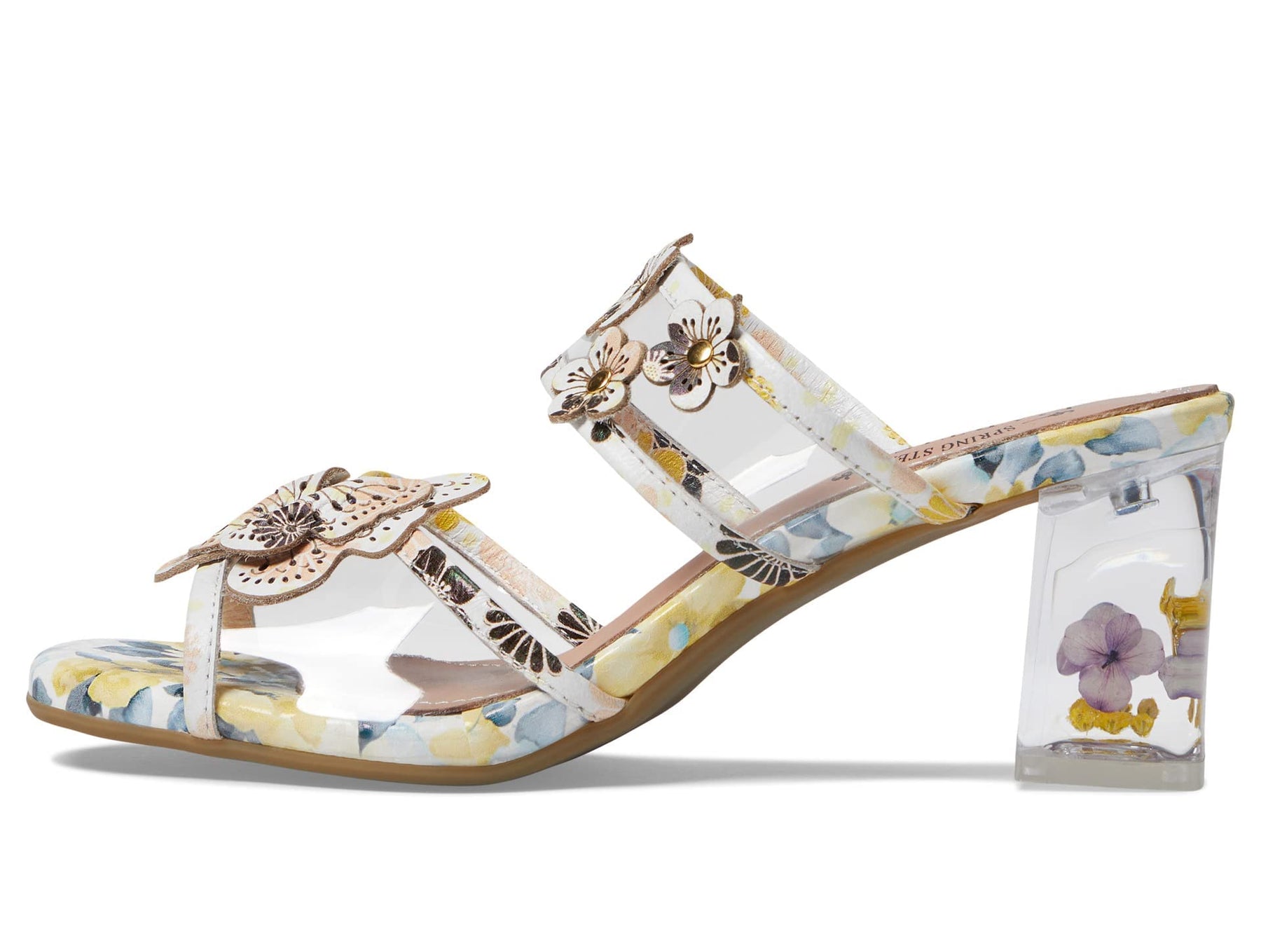 L'Artiste Style: ADORED This shoe will have you flying away into cloud nine. Inside this block heel we have real dried flowers encapsulated into it, truly one of a kind. The 3D butterfly and flowers at the vamp takes this shoe to another level. Upper: Leather and Synthetic Combo Lining: Synthetic Insole: Leather, Synthetic Outsole: Rubber Closure: Slip-on Heel Height: 2.75" Platform Height: 1/2" Features: Disclaimer: L'Artiste products are made with natural tanned leather using traditional hand painting techniques. This unique finishing process is used to create a natural effect with color variations to deliver authentic look and beauty.