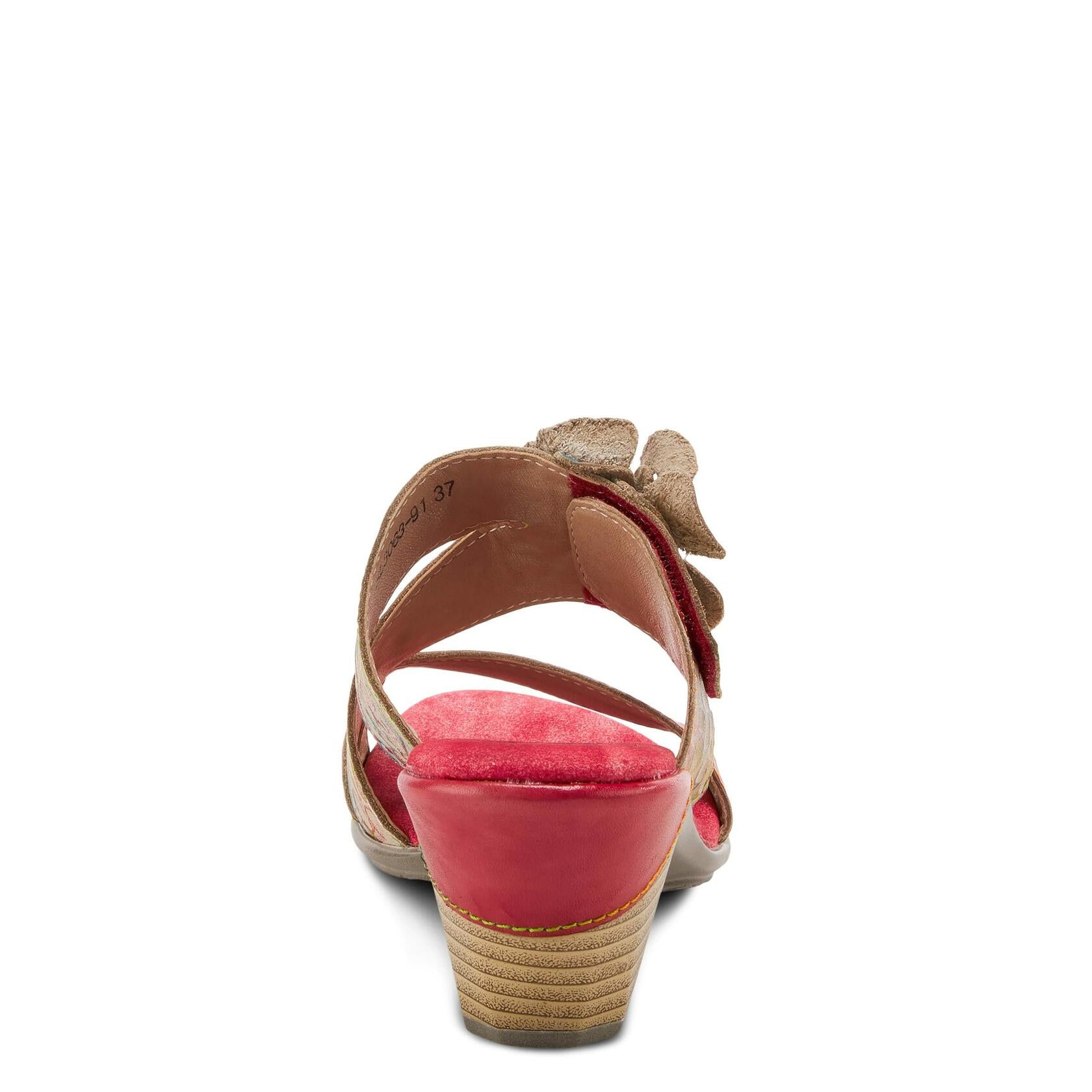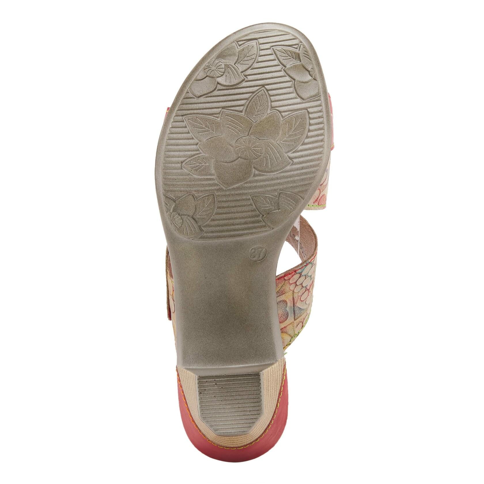 Description L'Artiste Style: CLASSICAL French inspired, premium leather asymmetrical slide sandal featuring a dimensional leather floral applique, rainbow stitchwork, and an adjustable hook and loop strap at the vamp all on a leather-wrapped, sculpted, comfort heel. Upper: Leather Lining: Synthetic Insole: Synthetic Outsole: Polyurethane Closure: Hook&Loop, Slip-on Heel Height: 2 1/2" Platform Height: 1/4" Features: - Adjustable, Comfort, Hand-painted, Padded Insole, Premium Disclaimer: LâArtiste products are made with natural tanned leather using traditional hand painting techniques. This unique finishing process is used to create a natural effect with color variations to deliver authentic look and beauty.