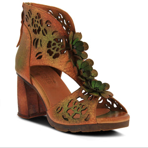 L'Artiste Style: FOXXA Modern peep square toed slide featuring metallic and silky cherry blossom mesh sides, hand painted leather colorful butterflies and pansies on a splayed combination leather and wood grain barrel heel. Spectacular, fabulous, and comfortable all rolled into one. Upper: Leather and Synthetic Combo Lining: Synthetic Insole: Synthetic Outsole: Rubber Closure: Slip-on Heel Height: 3" Platform Height: 1/4" Features: - Flexible Sole, Hand-painted, Padded Insole, Premium Disclaimer: L'Artiste products are made with natural tanned leather using traditional hand painting techniques. This unique finishing process is used to create a natural effect with color variations to deliver authentic look and beauty.