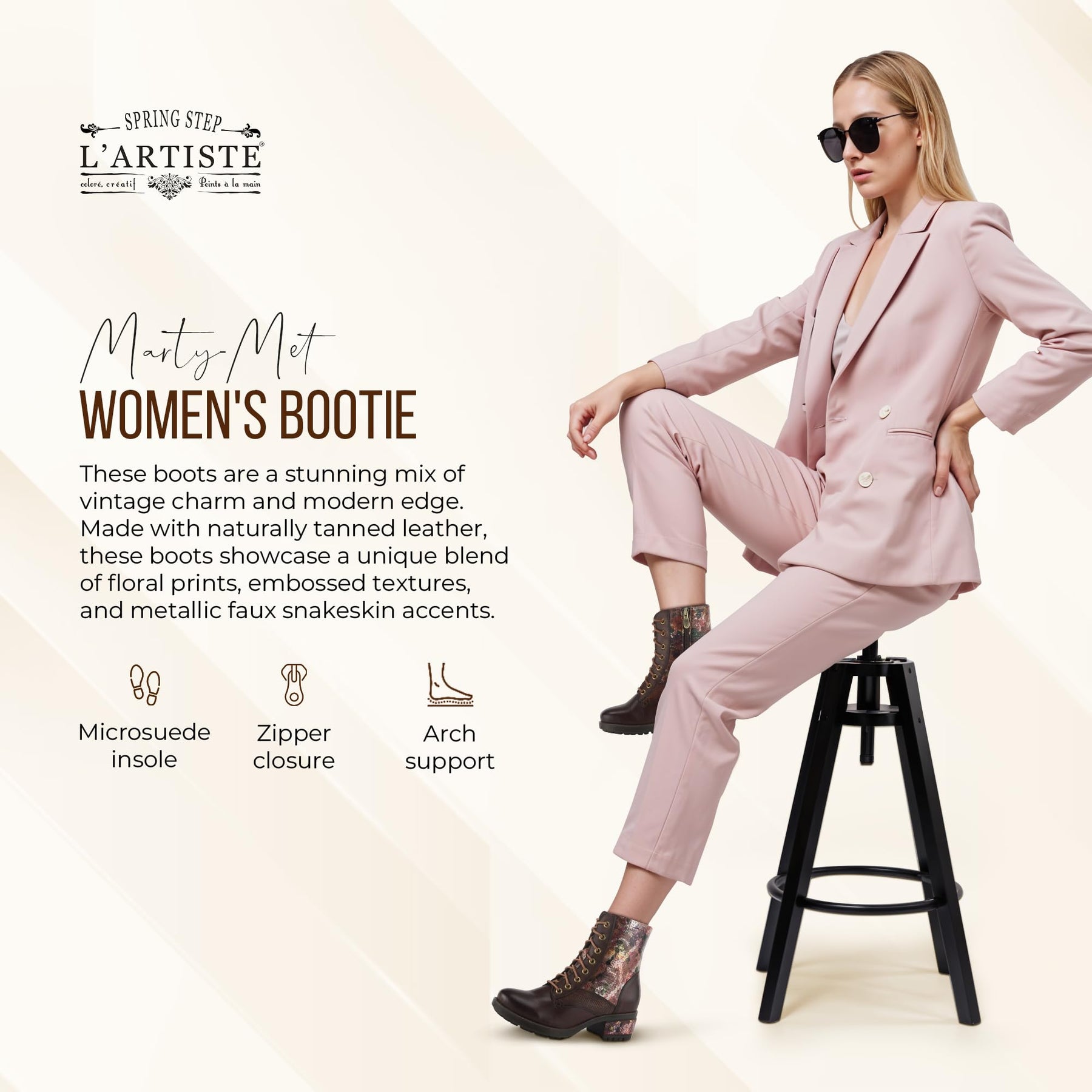 Step into style and comfort with the L'artiste by Spring Step Women's Marty Met Bootie. These stunning ankle boots combine edgy and feminine elements with a metallic faux snakeskin texture and floral prints. The multi colored design is bold and playful, while the embossed patterns on the upper and heel create a cohesive, eye catching look. Crafted with a mix of leather and synthetic materials, the boots offer durability and style. The microsuede and velvet lining, along with the padded insole, ensure a cozy fit for all day wear. The lace up and zipper closures make these boots easy to put on and take off while providing a secure fit. The 1 3/4"" heel and 1/2"" platform height give you a flattering lift without compromising comfort. With arch support and a flexible rubber outsole, these boots are perfect for those who prioritize both style and comfort. Each pair is hand painted using traditional techniques, making every boot one of a kind with beautiful natural color variations. Features: Unique metallic faux snakeskin and floral design. Hand painted leather for an authentic look. Comfortable microsuede lining and padded insole. Secure lace up and zipper closure. Flexible rubber outsole with arch support.