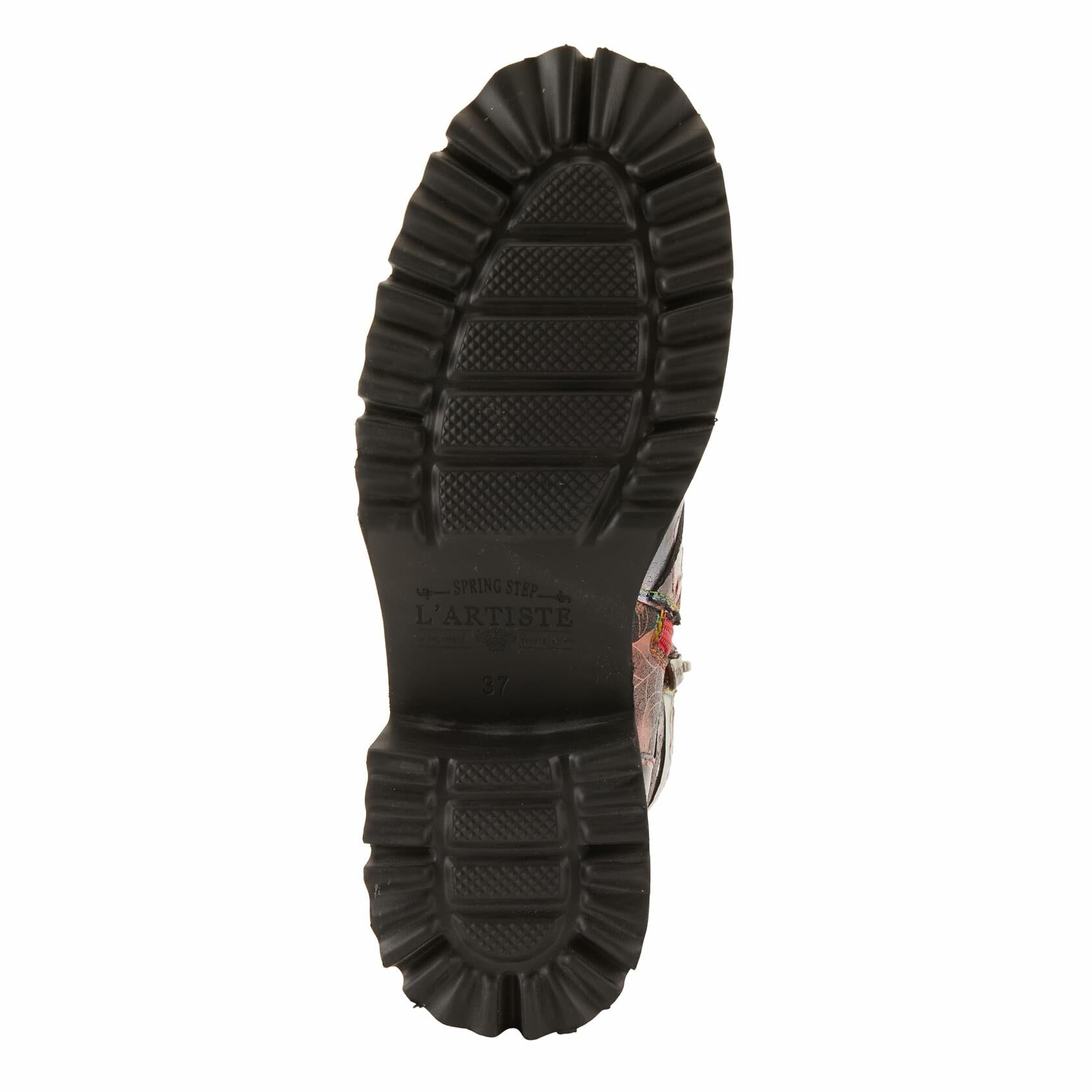 L'ARTISTE Style: ROSALEEN This chunky lugged boot with a 5-buckle applique is a standout footwear option, with a multi-colored hand-painted floral print that adds a touch of femininity to the edgy design. The toggle and zipper make it easy to slip on and off, while the sturdy lugged sole provides excellent traction for any weather condition. Whether paired with jeans or a skirt, these boots are the perfect blend of fashion and function. Upper: Leather Closure: Zipper Heel Height: 2" Platform Height: 1" Shaft Height: 6" Circumference: 9 3/4" Features: - Comfort - Hand-painted, Padded Insole, Premium, Textured Fit Recommendation: True to Size Disclaimer: LArtiste products are made with natural tanned leather using traditional hand painting techniques. This unique finishing process is used to create a natural effect with color variations to deliver authentic look and beauty.