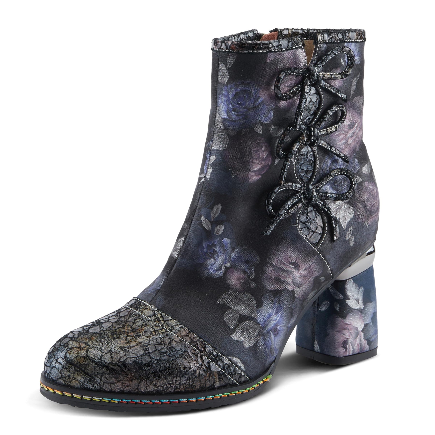 Description Sophistication meets style with this chic bootie! The pop of multi-colored metallics blend together perfectly with beautifully printed floral designs. The floral printed wrapped heel seamlessly complements the upper design, creating a stunning visual appeal. A sleek metallic cap toe that adds a touch of glamour. Three decorative ribbons adorn the outside, adding a unique and playful twist. To top it off, contrasted rainbow stitching around the welt adds an unexpected pop of color, making these booties a standout choice for the fashion-forward individual. Disclaimer: L’Artiste products are made with natural tanned leather using traditional hand painting techniques. This unique finishing process is used to create a natural effect with color variations to deliver authentic look and beauty.