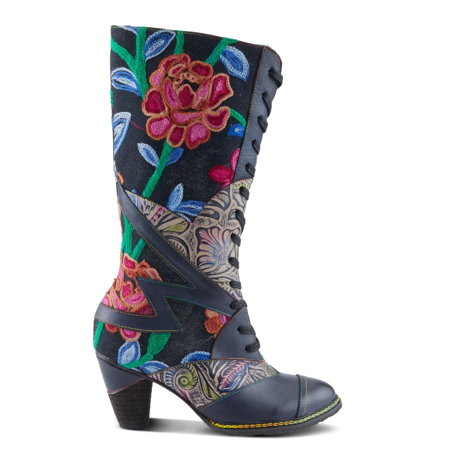 Description For the fashionista who wants to stand out from the crowd, MALAGIE-ROSE is the perfect way to make a stylish statement. The mid-shaft bootie silhouette is on-trend yet versatile enough to pair with dresses, jeans, leggings, and more. Whether you're dressing up or keeping it casual, MALAGIE-ROSE brings artistic flair to every outfit. Leather upper with Denim twill upper with eye-catching crewel embroidered accents. Lace-up front provides a custom, adjustable fit. Inside zipper for easy on and off. Stacked heel adds just enough lift without compromising comfort. Disclaimer: L’Artiste products are made with natural tanned leather using traditional hand painting techniques. This unique finishing process is used to create a natural effect with color variations to deliver authentic look and beauty.