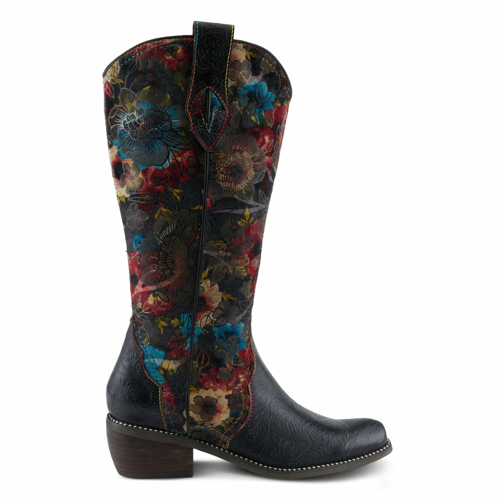 Description Whether you're line dancing or just running errands, these boots let you channel your inner cowgirl chic. Slip them on with your favorite jeans or dress to add that perfect dose of western flair to any outfit. Saddle up and get ready to turn heads in the new RODEOQUEEN-VIV boots! Intricate tonal embossed designs on the front and back heel for eye-catching texture. Soft printed floral velvet shaft adds a feminine, romantic vibe. Snip toe front gives An authentic cowgirl look. Stacked wooden heel for that authentic cowboy silhouette with stability. Disclaimer: LArtiste products are made with natural tanned leather using traditional hand painting techniques. This unique finishing process is used to create a natural effect with color variations to deliver authentic look and beauty.