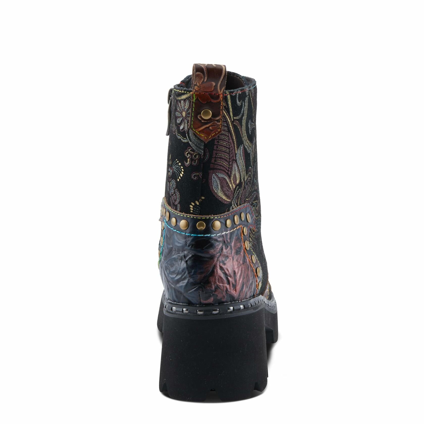 Description Introducing our SEVERITY lace up combat style boot! This edgy design features a textured cap toe and heel counter, outlined with studs for added flair. The embossed handpainted flowers and printed suede shaft give this boot a unique and stylish look. Built on a lug sole with rivets wrapping around the welt, these boots are not only fashionable but also durable for all your adventures. Textured cap toe and heel counter outlined with studs. Embossed hand-painted flowers add a touch of uniqueness. Printed suede shaft for added flair. Sturdy lug sole with rivets wrapping around the welt. Disclaimer: LArtiste products are made with natural tanned leather using traditional hand painting techniques. This unique finishing process is used to create a natural effect with color variations to deliver authentic look and beauty.