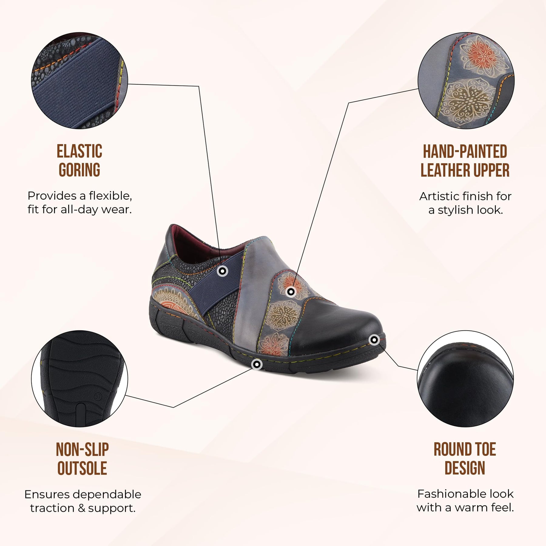The L'artiste women's lata slip on burnished clog is a perfect blend of artistic design and everyday functionality. Featuring a hand painted geometric pattern with rainbow stitching, this clog delivers a bold, vibrant aesthetic that stands out. Its easy slip on style, with a convenient gore and zipper closure, ensures maximum comfort and flexibility. Made with premium leather and textile for the upper, synthetic lining and insole, and a durable rubber outsole, these clogs are crafted for long lasting wear. Designed with arch support and a flexible sole, they provide comfort throughout the day, making them ideal for work or casual outings. The true to size fit and unique hand finishing techniques guarantee a beautiful, one of a kind shoe for any shoe collection. Features: Hand painted geometric design adds artistry to any outfit. Arch support and comfort sole keeps feet supported. Premium leather and textile upper ensures durability and stylish appeal. Convenient zipper closure makes it quick and easy to slip on and off. Durable rubber outsole provides excellent traction and long lasting use.