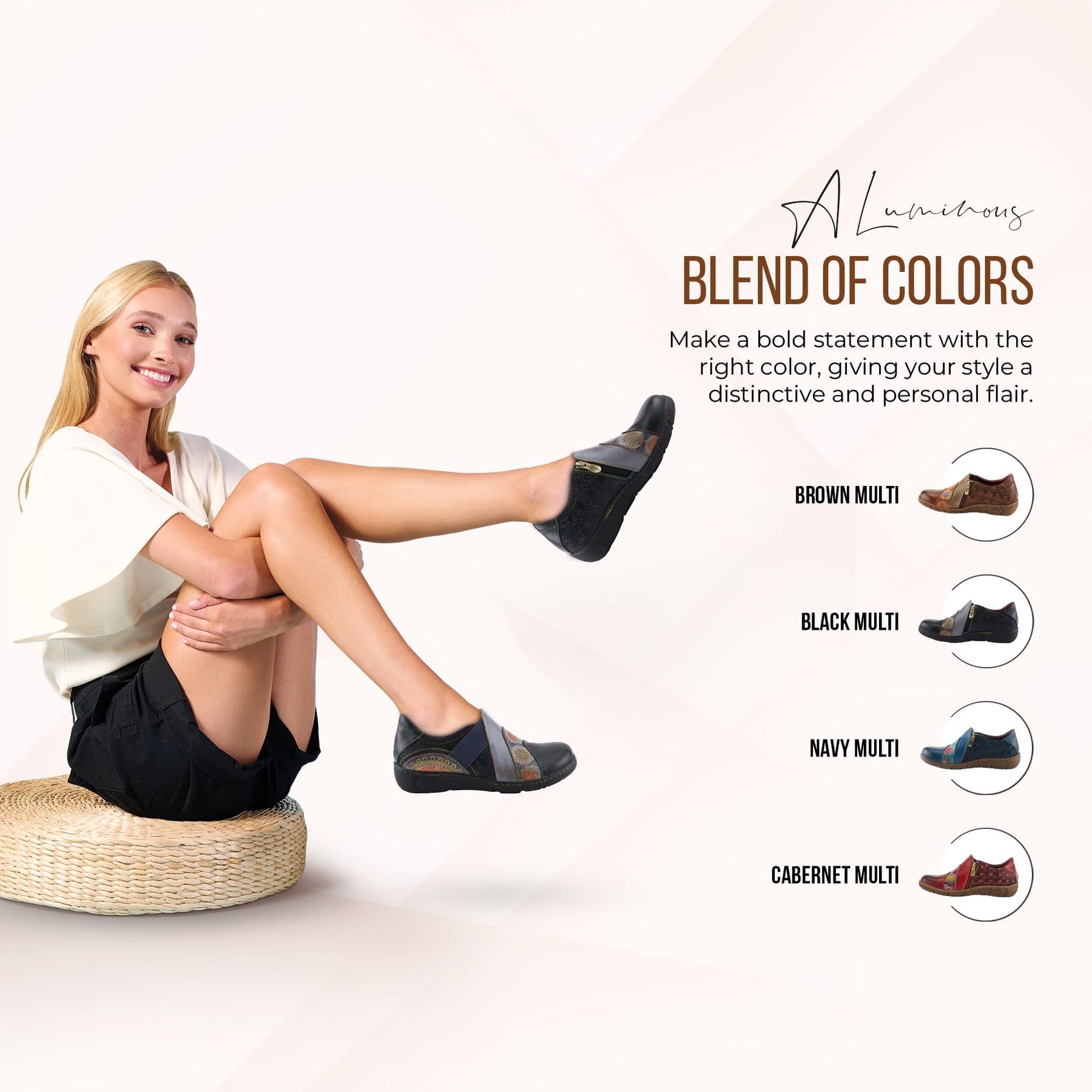 The L'artiste women's lata slip on burnished clog is a perfect blend of artistic design and everyday functionality. Featuring a hand painted geometric pattern with rainbow stitching, this clog delivers a bold, vibrant aesthetic that stands out. Its easy slip on style, with a convenient gore and zipper closure, ensures maximum comfort and flexibility. Made with premium leather and textile for the upper, synthetic lining and insole, and a durable rubber outsole, these clogs are crafted for long lasting wear. Designed with arch support and a flexible sole, they provide comfort throughout the day, making them ideal for work or casual outings. The true to size fit and unique hand finishing techniques guarantee a beautiful, one of a kind shoe for any shoe collection. Features: Hand painted geometric design adds artistry to any outfit. Arch support and comfort sole keeps feet supported. Premium leather and textile upper ensures durability and stylish appeal. Convenient zipper closure makes it quick and easy to slip on and off. Durable rubber outsole provides excellent traction and long lasting use.