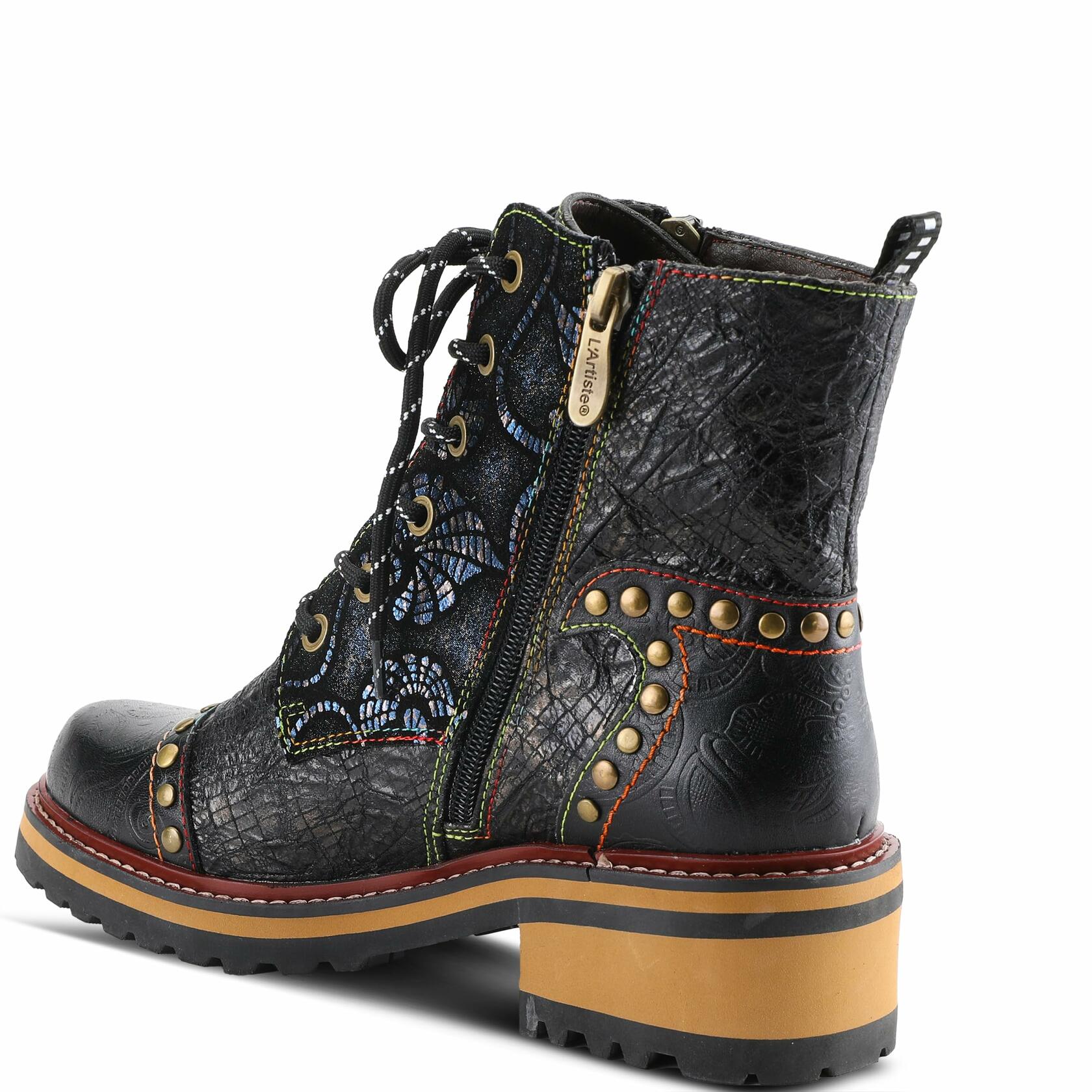 The L'Artiste Rugup Bootie is a stylish and comfortable ankle boot that’s sure to stand out. Made with a mix of crinkle, metallic and embossed leather, these hand painted boots are truly unique. Decorative studs, rainbow stitching and a two tone sole add a touch of elegance to every step. Inside, the soft faux fur lining and cushioned insole keep your feet warm and cozy, making them perfect for wearing all day. The lace up front lets you adjust the fit and the side zipper makes them easy to slip on and off. These boots are not only beautiful but also practical, with a durable rubber sole that gives you great grip on all kinds of surfaces. They have a 2-inch heel, a 3/4-inch platform, a 5 1/4-inch shaft height and an adjustable fit 9-11 inch circumference, making them both stylish and comfortable. Whether you're dressing up for a night out or keeping it casual, the L'Artiste Rugup Bootie is a versatile choice for any occasion.
