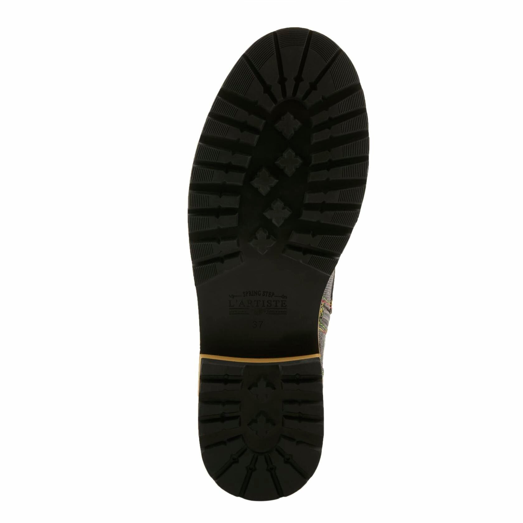 The L'Artiste Rugup Bootie is a stylish and comfortable ankle boot that’s sure to stand out. Made with a mix of crinkle, metallic and embossed leather, these hand painted boots are truly unique. Decorative studs, rainbow stitching and a two tone sole add a touch of elegance to every step. Inside, the soft faux fur lining and cushioned insole keep your feet warm and cozy, making them perfect for wearing all day. The lace up front lets you adjust the fit and the side zipper makes them easy to slip on and off. These boots are not only beautiful but also practical, with a durable rubber sole that gives you great grip on all kinds of surfaces. They have a 2-inch heel, a 3/4-inch platform, a 5 1/4-inch shaft height and an adjustable fit 9-11 inch circumference, making them both stylish and comfortable. Whether you're dressing up for a night out or keeping it casual, the L'Artiste Rugup Bootie is a versatile choice for any occasion.