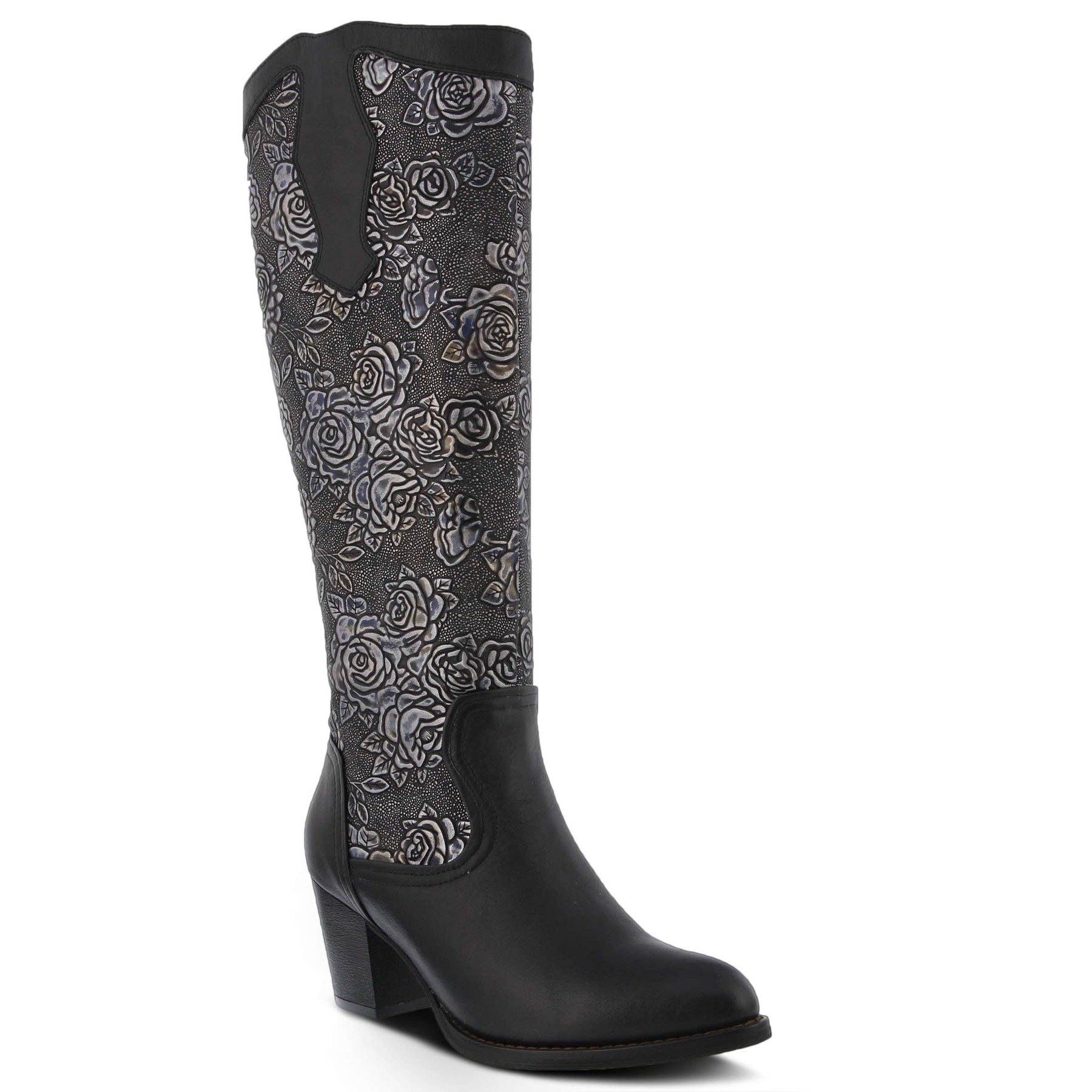 L'Artiste Style: Neena Marvelous combination of soft full grain burnished and polished leather and a complimentary floral metallic two toned imitation leather shaft on this exquisite tall, heeled boot. Heel Height (approximately): 2 1/2" Platform Height (approximately): 1/4" Shaft Height (approximately): 15" Circumference (approximately): 15" Features: -Soft full grain burnished and polished leather vamp and western style curved topline, combined with a complimentary floral metallic two toned imitation leather shaft -Classic western style pointed toe silhouette -Full length inside zipper with a brushed metal zipper pull -Soft and cozy textile and imitation leather lining -Imitation leather comfort padded insole -Cuban style heel with textured grain effect -Rubber outsole and heavy stitched welt -Imported Disclaimer: LArtiste products are made with natural tanned leather using traditional hand painting techniques. This unique finishing process is used to create a natural effect with color variations to deliver authentic look and beauty.
