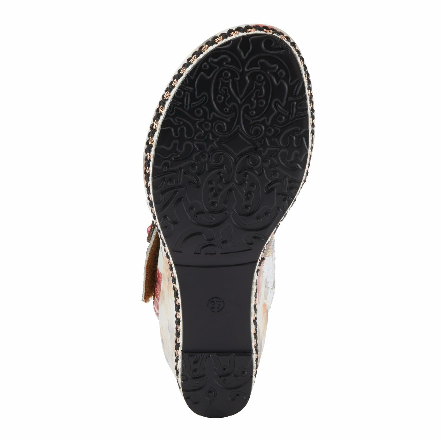 Experience elegance and comfort with the L'Artiste Women's BLISSFUL Hook and Loop Sandals. Crafted with a floral-embossed leather upper and adorned with decorative flower accents, these sandals combine artistic design with timeless sophistication. The hook-and-loop closures on the toe and ankle straps ensure a secure, customized fit, while the cushiony microsuede footbed offers cloud-like comfort with every step. A tonal printed wedge wrapped with black and white jute detailing and gleaming gold accents adds a touch of glamour. Perfect for any occasion, the BLISSFUL sandals seamlessly blend luxury, versatility, and all-day wearability.