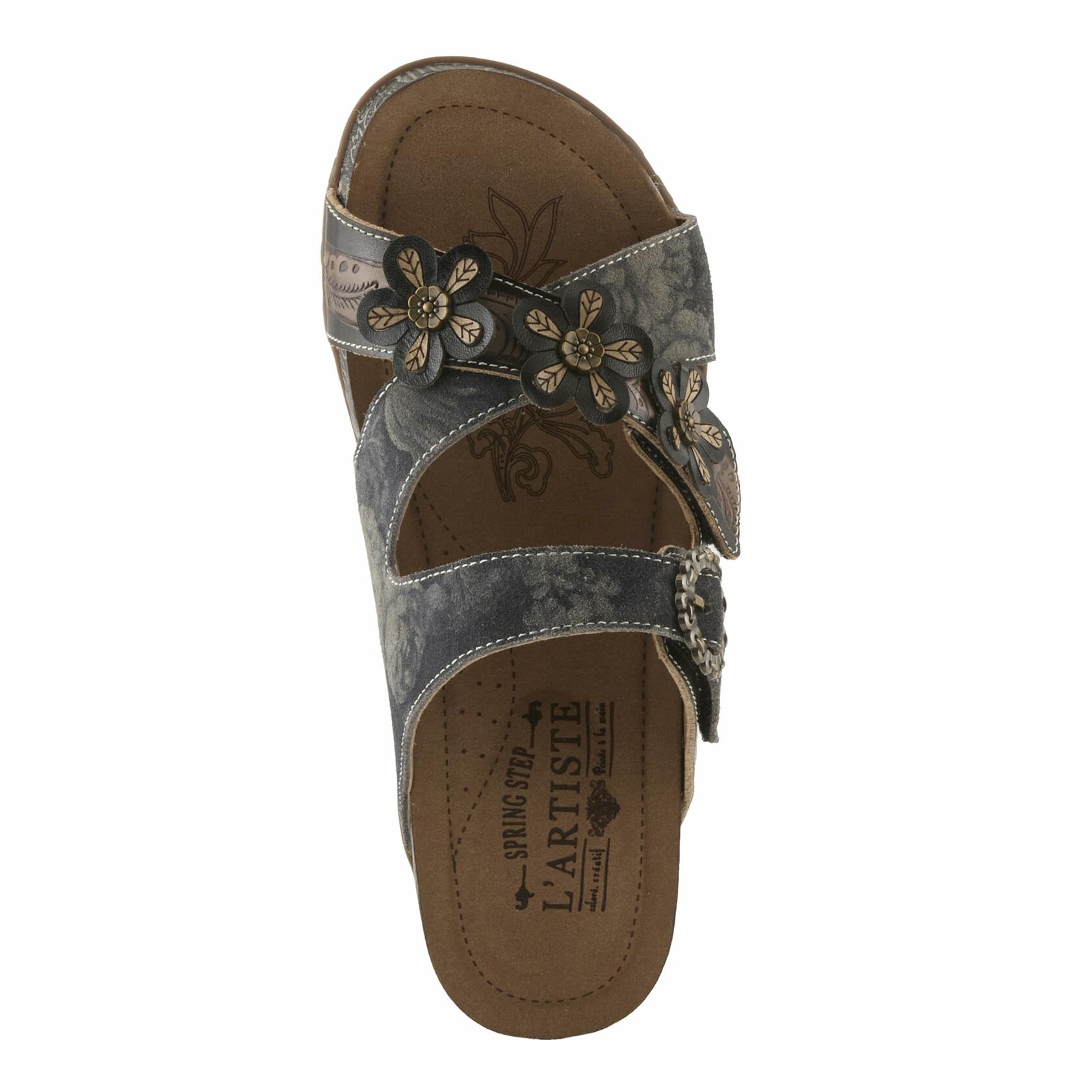 Add a touch of elegance to your day with the L'Artiste Women's CAELANA Slide Sandals. Crafted from hand-painted leather, these sandals feature three exquisite floral accents on the crisscross front strap, bringing personality and life to any outfit. The decorative buckle on the ankle strap adds a chic flair, while the cushioned footbed provides all-day comfort. Designed with a hook-and-loop closure for a secure and tailored fit, the CAELANA sandals are perfect for running errands, casual gatherings, or relaxing weekends. Elevate your everyday look with these unique, artistic slides.