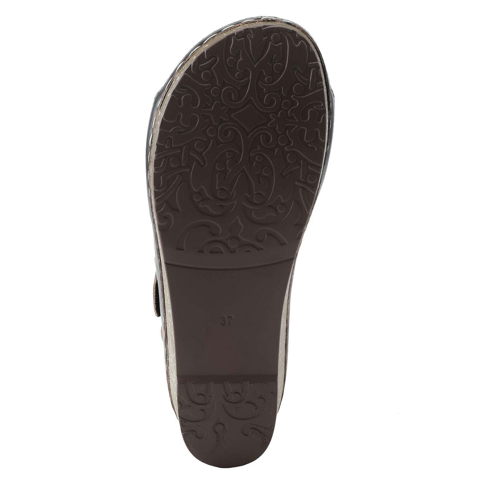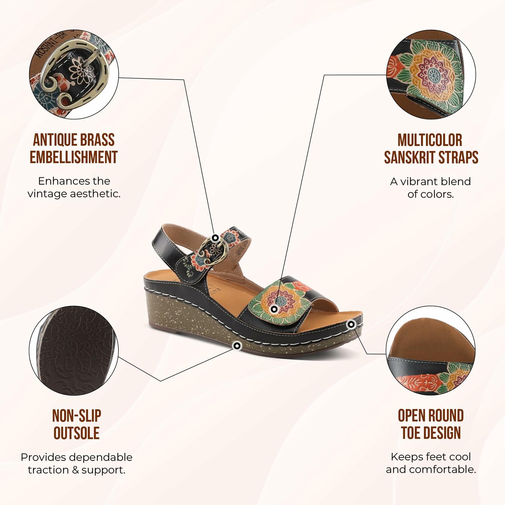 Step into artistic elegance with the L'Artiste Women's ROSHNI Slingback Sandals. Featuring beautifully hand-painted leather uppers adorned with multicolored abstract Sanskrit and floral designs, these sandals effortlessly merge comfort, sophistication, and vibrant style. Double adjustable hook-and-loop straps accented with antique brass lucky horseshoe embellishments ensure a customizable fit, while the cushioned microsuede insole and cork-inspired wedge provide all-day comfort. With a durable rubber outsole for stability, the ROSHNI sandals deliver distinctive beauty and supportive comfort, making them the perfect choice for casual outings or special occasions.