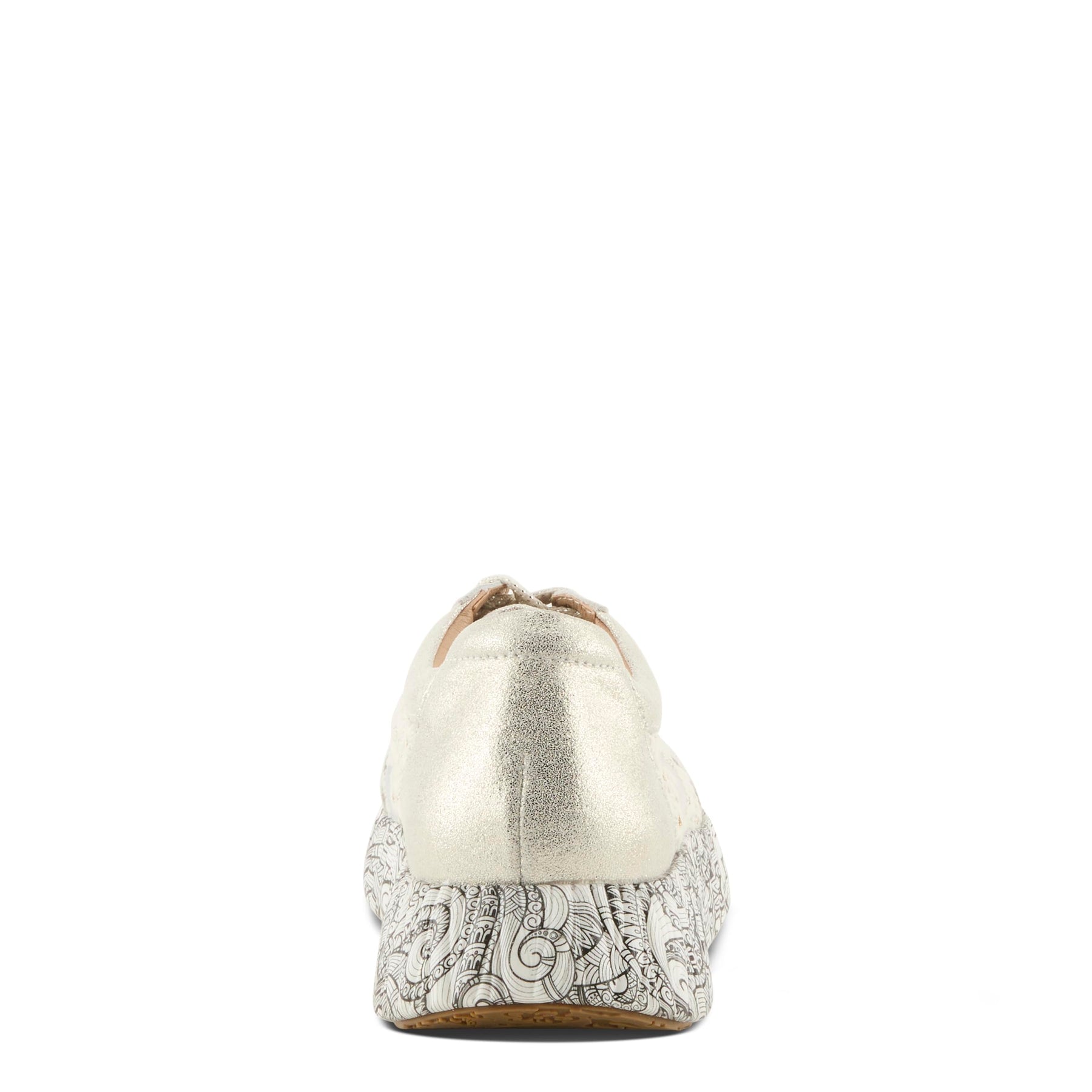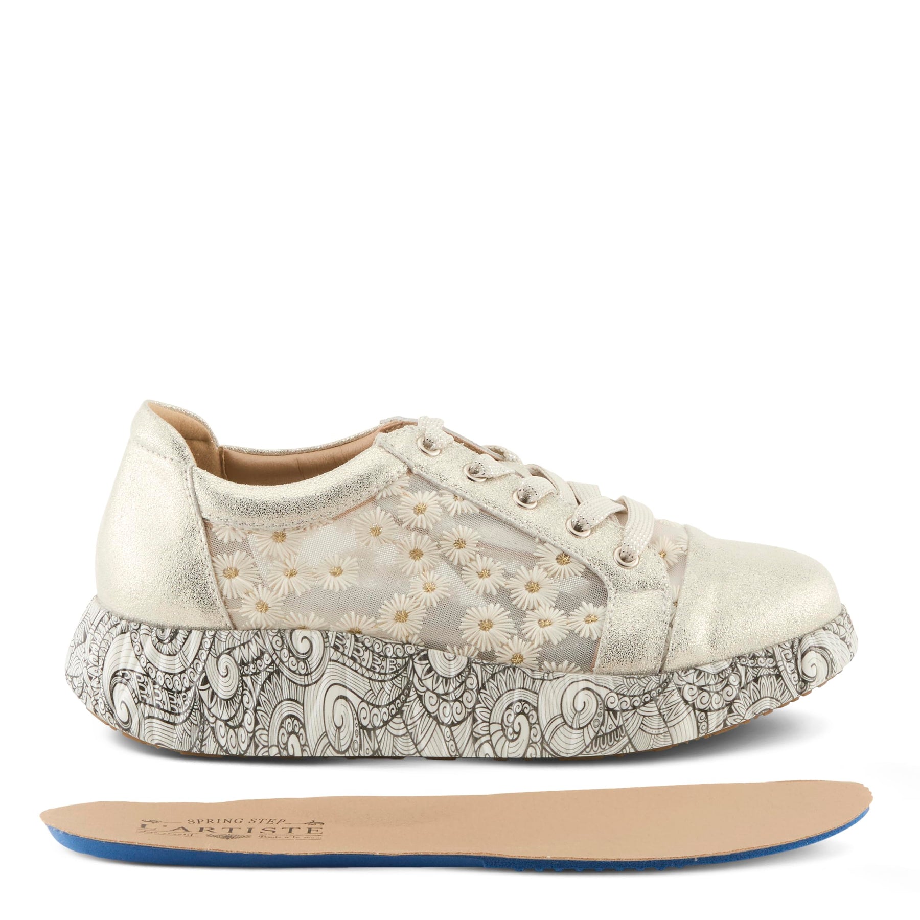 Elevate your casual wardrobe with the L'Artiste Women's SNEAKHEART Lace-Up Sneakers. Featuring a shimmering metallic upper adorned with intricate floral embroidery, these sneakers seamlessly blend street-chic style with sophistication. The breathable mesh underlay ensures comfort, while the padded back collar provides ankle support for all-day wear. Designed with metallic laces and a removable microsuede insole, these sneakers allow for a customizable fit and effortless style. Whether paired with jeans or a dress, the SNEAKHEART sneakers add a unique flair to any outfit.