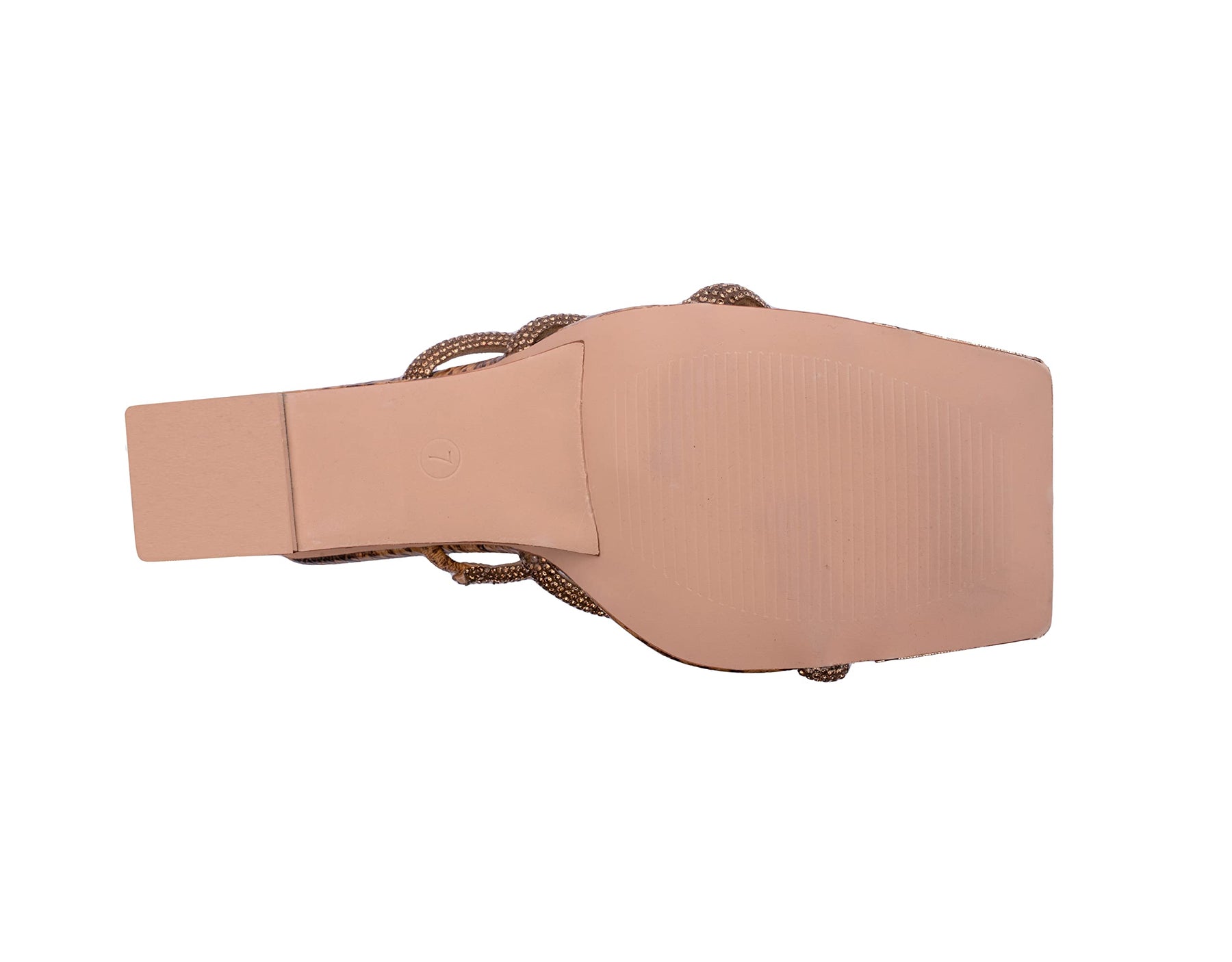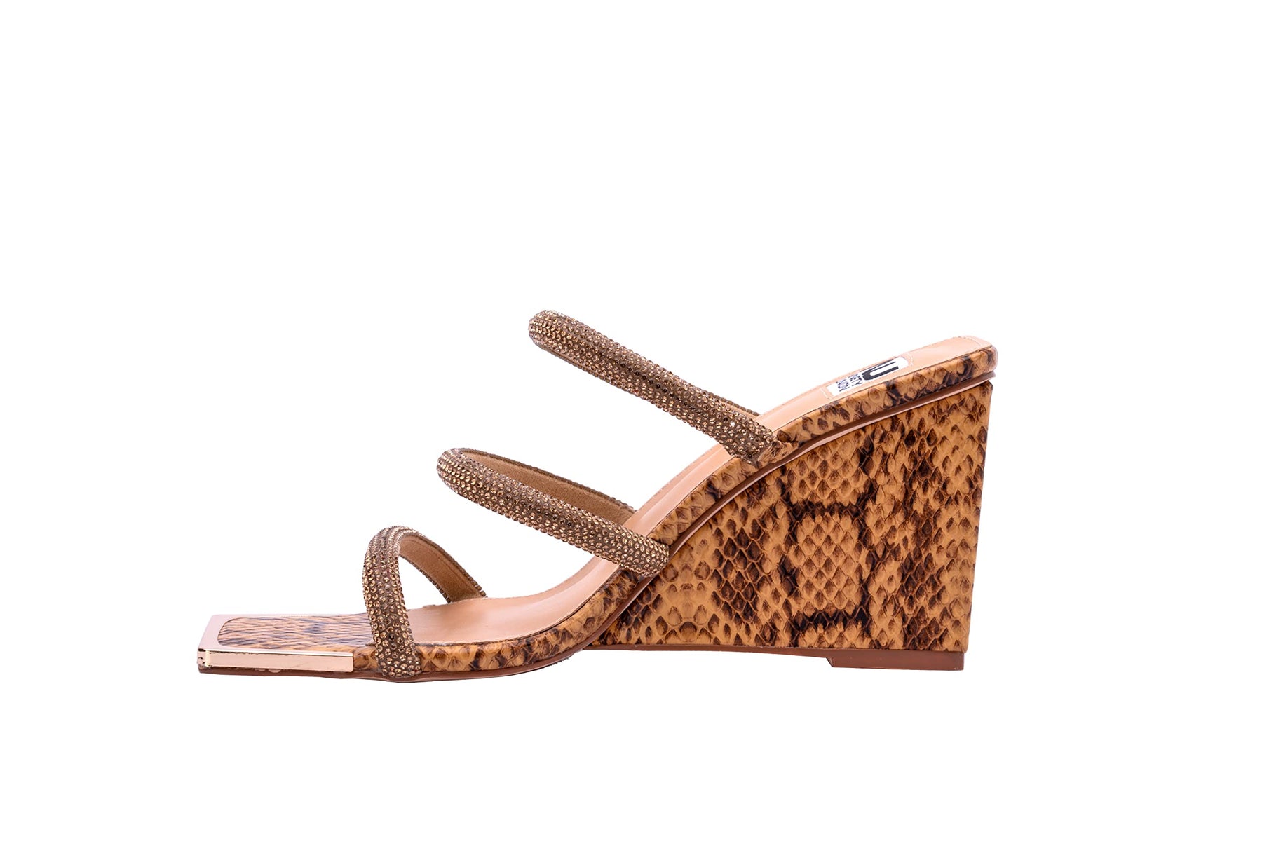 A mix of tropical bright colors, rhinestone straps, and a metal square toe will have heads turning. A comfortable feminine, block wedge finishes this stylish look.