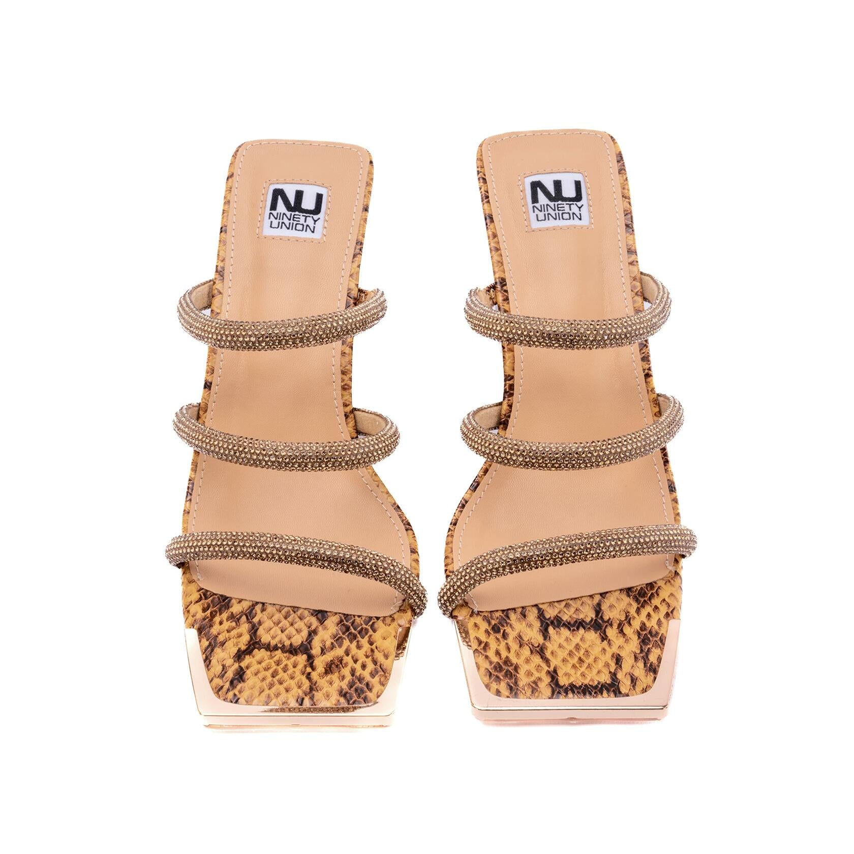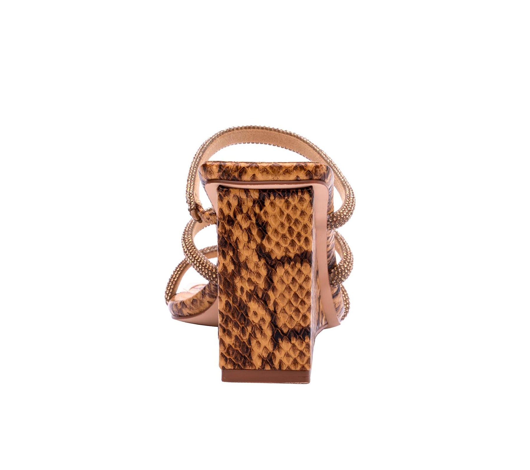 A mix of tropical bright colors, rhinestone straps, and a metal square toe will have heads turning. A comfortable feminine, block wedge finishes this stylish look.