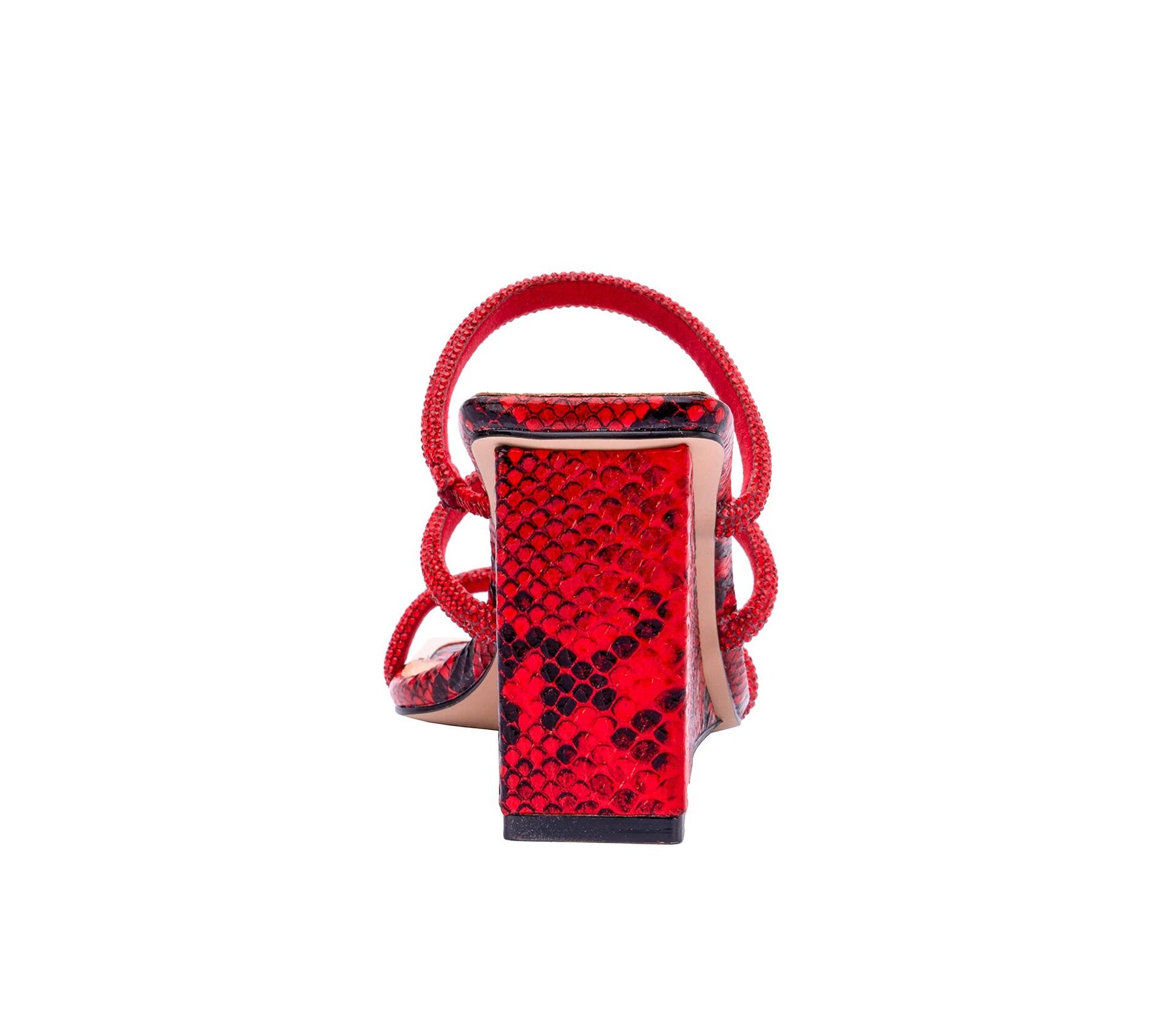 A mix of tropical bright colors, rhinestone straps, and a metal square toe will have heads turning. A comfortable feminine, block wedge finishes this stylish look.