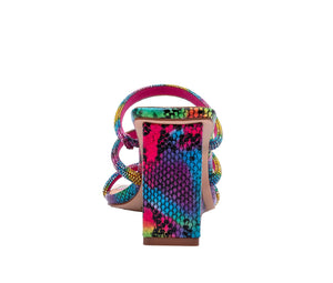 A mix of tropical bright colors, rhinestone straps, and a metal square toe will have heads turning. A comfortable feminine, block wedge finishes this stylish look.