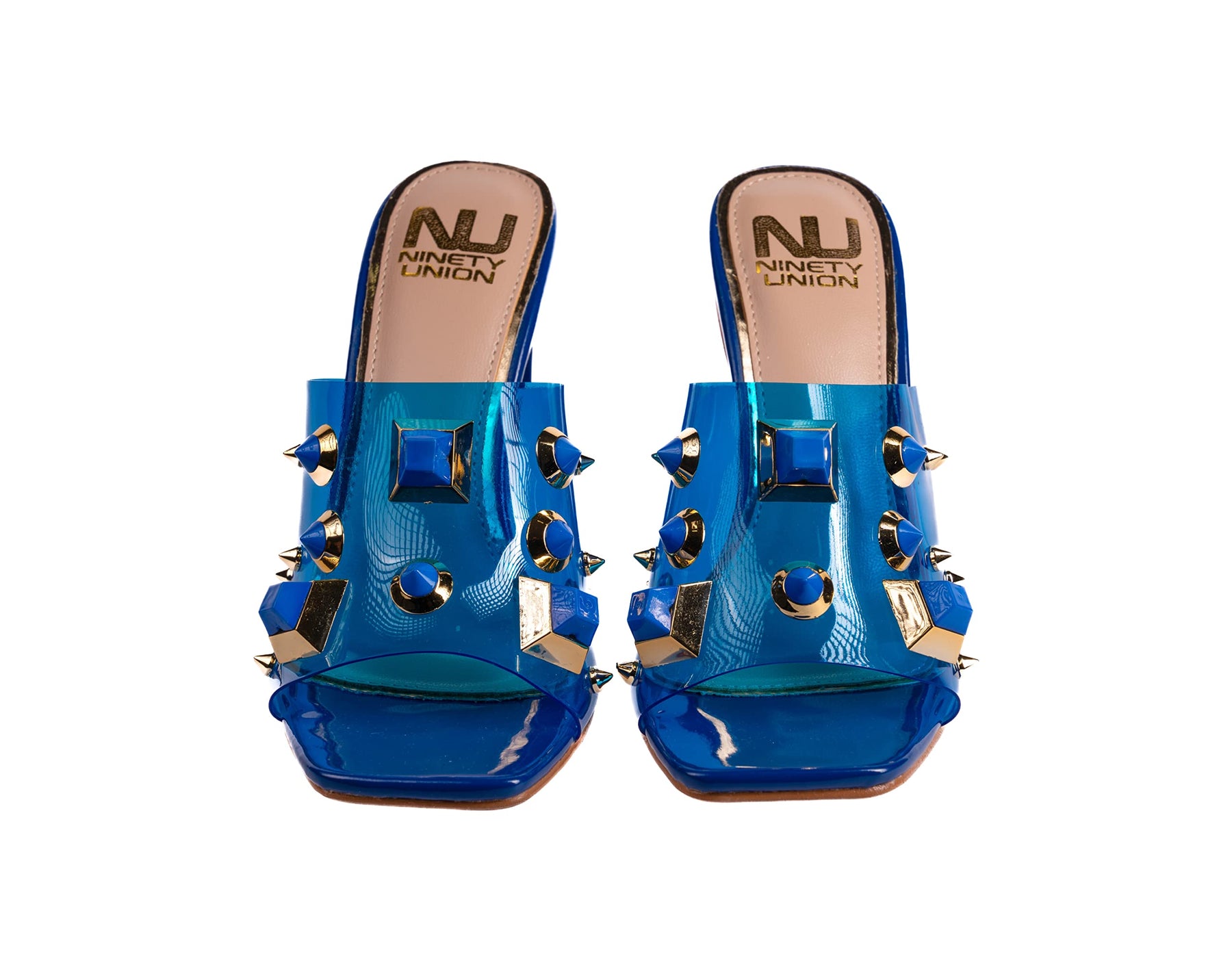 Let loose your flashy vibes strutting in the Vegas sandal by Ninety Union. Fashionably elevated by a metallic circular heel, this slip-on sandal dons a transparent lucite upper that's accented with colorful stones for a playful look.