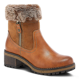 *Casual and cozy, this ankle boot is sure to become a fall favorite *Faux leather upper with soft ribbed knit cuff and antiqued metal hardware *4-3/4" shaft height *Inside zip closure with lace-up option *Faux fur/man-made lining *Lightly cushioned footbed *1-1/2" block heel with 3/4" platform *Please see size drop-down menu for brand-specific Euro conversion chart