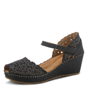 Patrizia Style: GENNINA Mary-Jane inspired closed heel, peep-toe shoe emphasizing gorgeous laser cut design with embroidery detail, all stitched to construction on a comfort wedge. Heel Height: 2 1/2" Platform Height: 5/8" Features: - Upper: Synthetic - Lining: Synthetic - Insole: Synthetic - Outsole: Polyurethane - Closure: Hook&Loop - Upper Finishing: Embroidery,Laser Cut - Heel Type: Wedge - Toe Type: Peep Toe,Round Toe - Features: Adjustable,Comfort,Padded Insole,Vegan Friendly