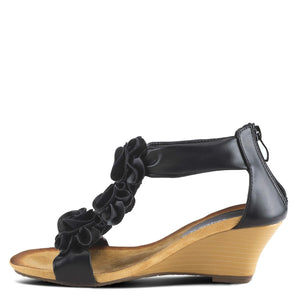 Patrizia Style: Harlequin Chic flower t-strap wedge sandal with soft tubular straps. Heel Height (approximately): 2 1/2", 1/2" platform. Features: -Synthetic leather, tonal dimensional flowers, soft insole. -Back zipper closure. -Synthetic leather lining. -Soft microfiber insole. -Polyurethane outsole. -Imported.