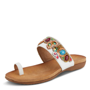 Patrizia Style: AMALFI A single strap toe loop slide sandal wrapped in multicolored beads and stones Upper: Synthetic Lining: Synthetic Insole: Synthetic Outsole: TPR Closure: Slip-on Heel Height: 1" Platform Height: 1/2" Features: - Comfort, Footbed