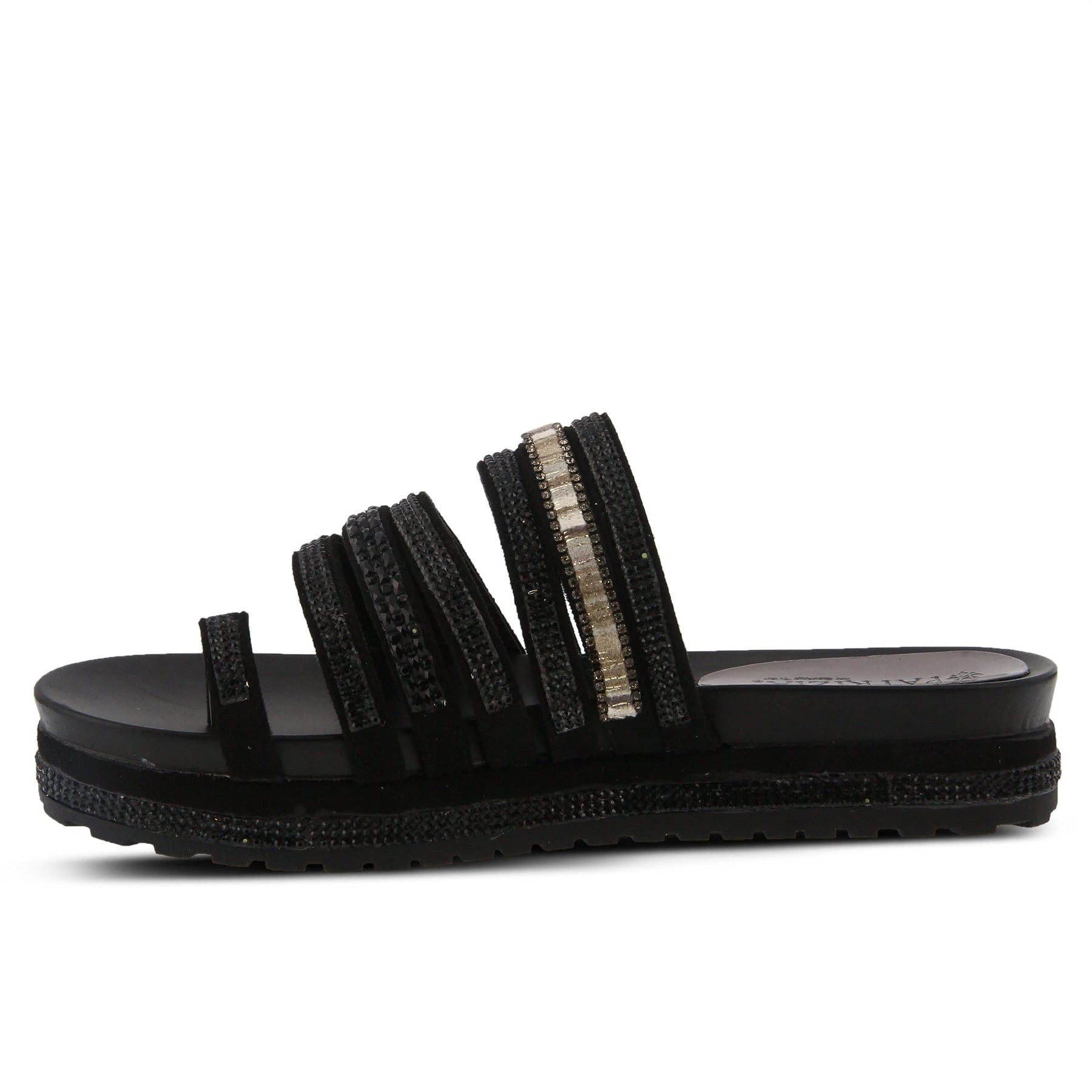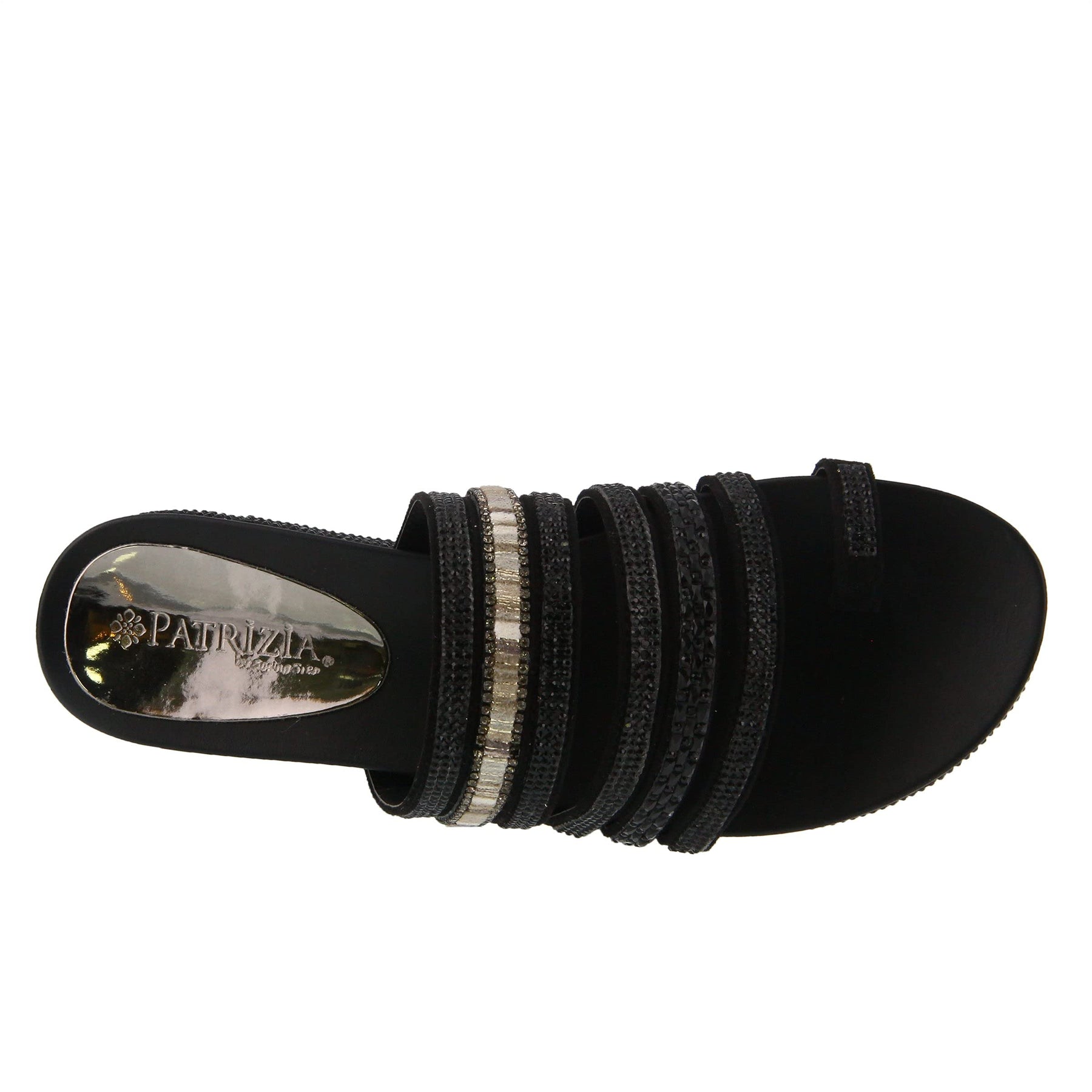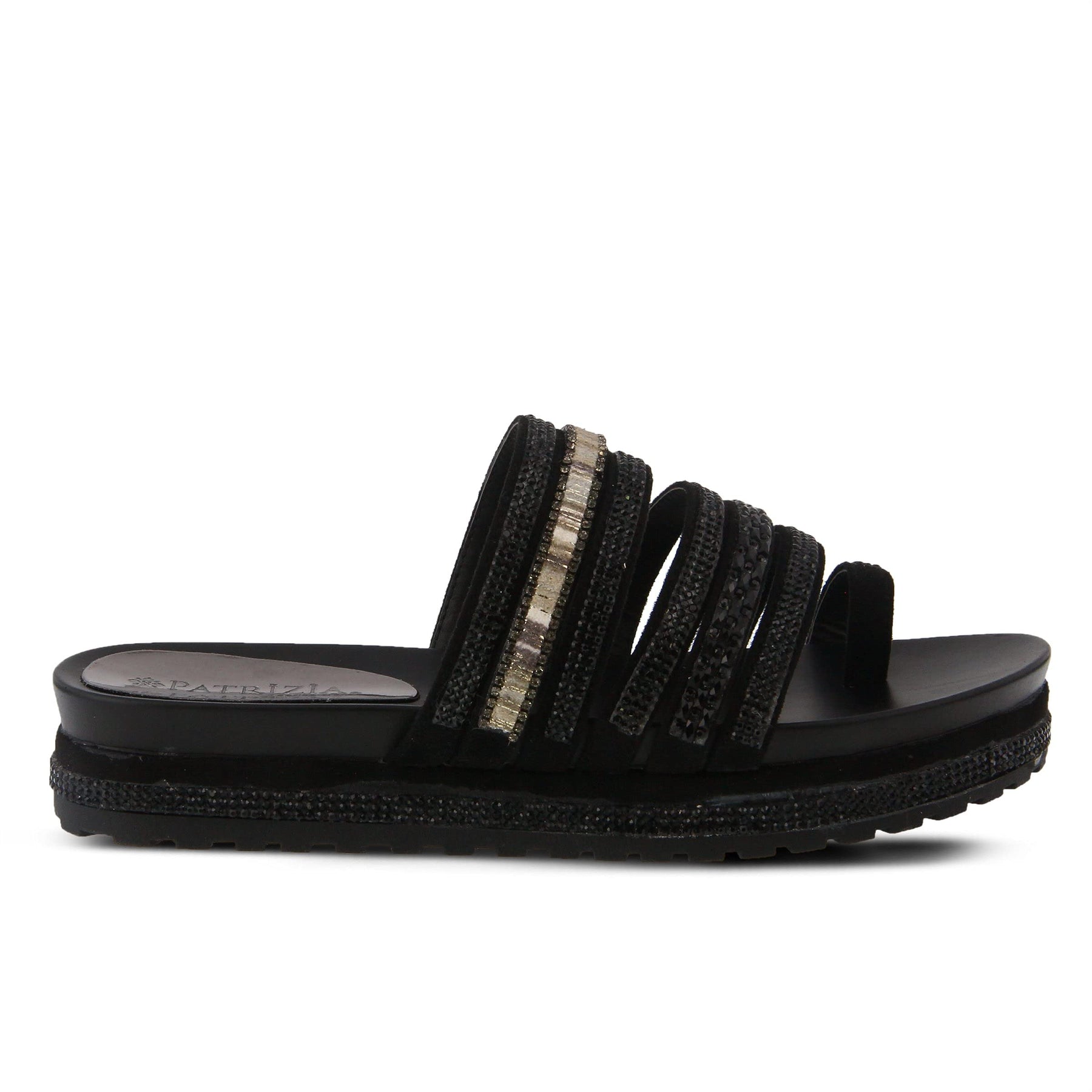 Slip right in to some summertime fun with these Patrizia™ Bugmadi sandal. Textile upper featured in a strappy design. Slip-on construction. Single toe loop. Jeweled design on straps and midsole. Textile lining and cushioned insole. Synthetic sole. Imported. Measurements: Weight: 10 oz Product measurements were taken using size 39 (US Women's 8.5), width B - Medium. Please note that measurements may vary by size. Weight of footwear is based on a single item, not a pair.