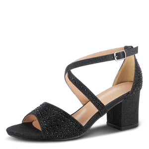 Patrizia Style: DELAMORE Classy criss-cross strapped, open-toe sandal starring beautiful tonal crystals on a comfort blocked heel. Heel Height: 2 1/4" Platform Height: 3/8" Features: - Upper: Synthetic - Lining: Synthetic - Insole: Synthetic - Outsole: Rubber - Closure: Buckle - Accents: Rhinestons - Upper Finishing: Gloss - Heel Type: Block - Toe Type: Almond Toe,Open Toe - Features: Comfort,Elastic,Padded Insole,Vegan Friendly