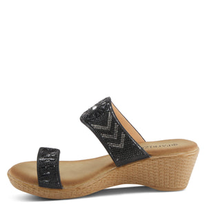 from 0 reviewsPatrizia Style: GEMINATA Slide sandal with a toe loop, decorated in rhinestones that make up geometric arrow patterns and a center jewel on a padded insole for comfort and basket weave outsole design Upper: Synthetic Lining: Synthetic Insole: Synthetic Outsole: Polyurethane Closure: Slip-on Heel Height: 2" Platform Height: 3/4" Features: - Comfort
