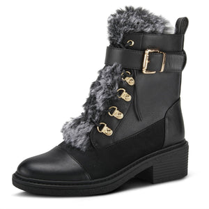 Patrizia Style: Hilvia Marvelous lace-up bootie featuring a decorative buckle strap, a pull up tab, gold tone metal hardware and a faux fur covered tongue. Attributes: - Heel Height: 2" - Platform Height: 3/4" - Upper: Synthetic, Faux Fur - Lining: Faux Fur, Synthetic - Insole: Faux Fur - Outsole: TPR - Boot Shaft: 6" - Boot Circum.: 6"-11" - Closure: Zipper, Lace-up - Features: Vegan Friendly, Comfort, Padded Insole Imported