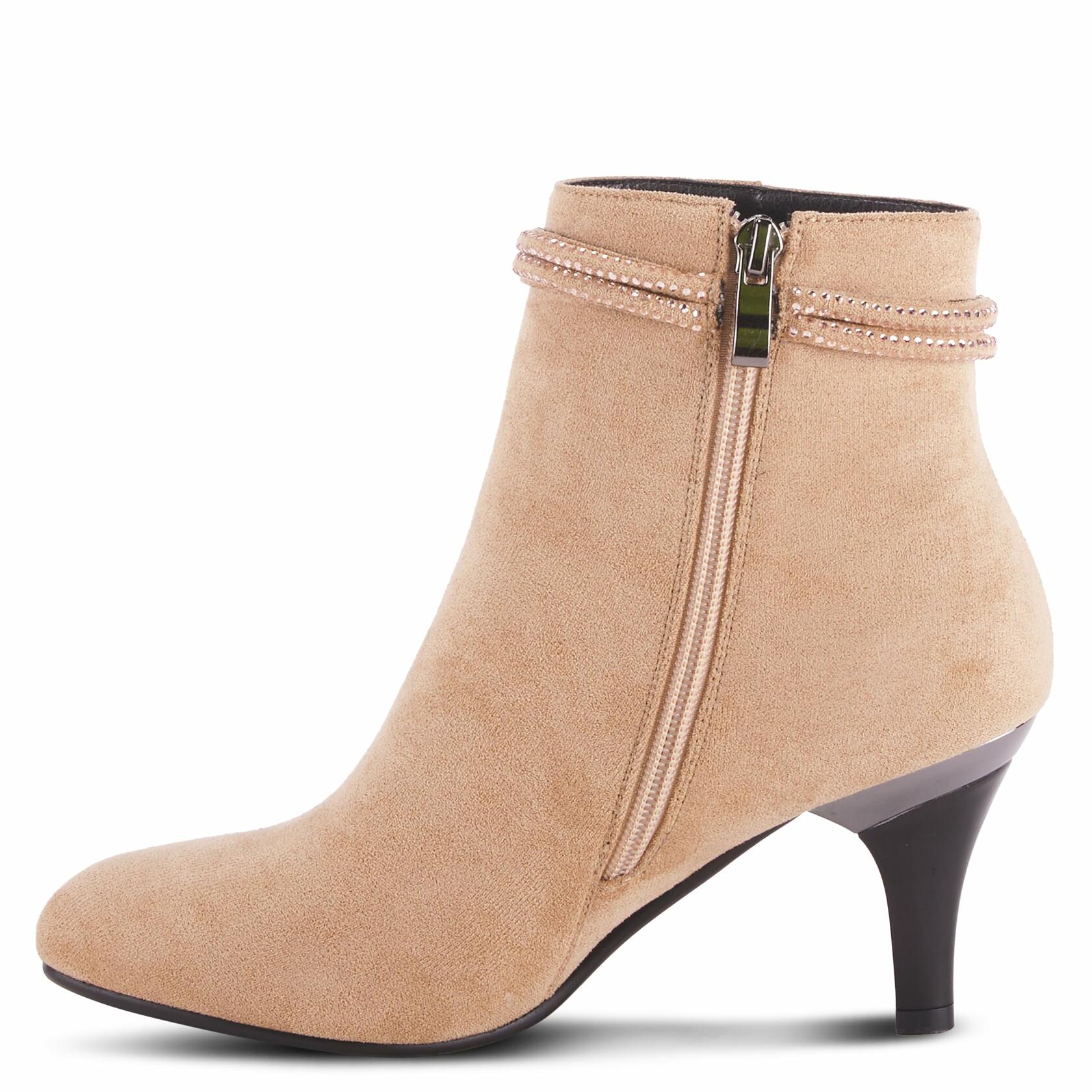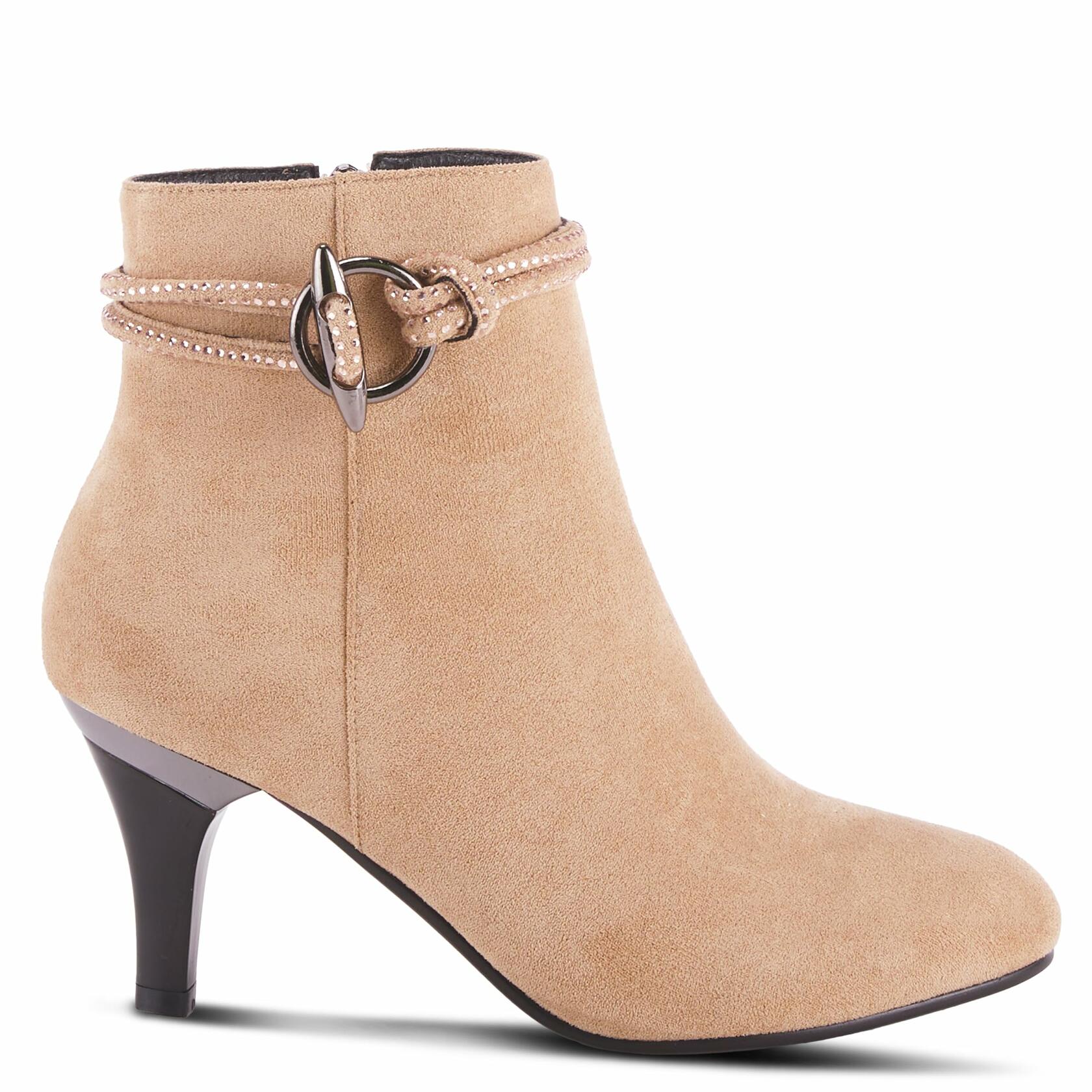 PATRIZIA Style: KITTEN This microsuede cone heeled bootie is the perfect combination of style and function, with a decorative rhinestone O-ring cord and zipper closure for easy wearability. The cone heel adds a touch of sophistication, while the microsuede material gives it a luxurious feel. Whether paired with jeans or a dress, this bootie is sure to elevate any outfit. Upper: Microsuede Lining: Synthetic, Textile Insole: Synthetic, Textile Outsole: Rubber Closure: Zipper Heel Height: 2 3/4" Shaft Height: 6" Circumference: 8" Features: - Comfort, Flexible Sole - Padded Insole, Premium Fit Recommendation: True to Size