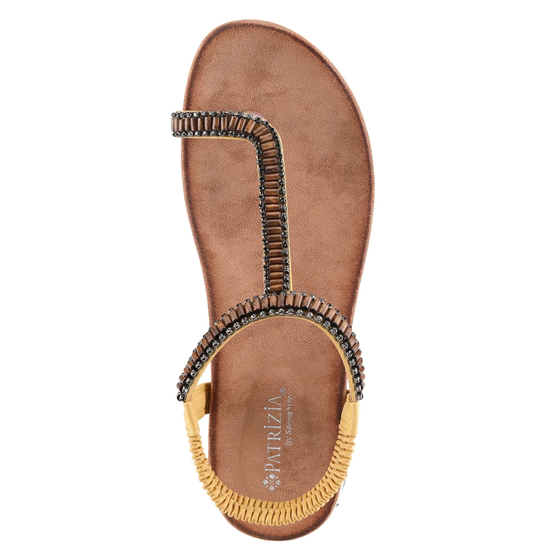Women's Patrizia, Kummi Sandal. Nothing says summer like a strappy sandal, and our Kummi toe loop sandals do not disappoint. Embellished with dainty wooden cylinder beads, surrounded by sparkling crystals, these modern toe loop sandals have a flexible outsole and a soft hugging footbed. With an easy slip-on style, they're perfect for warm weather days. Strappy manmade upper with pretty beads and rhinestones Soft microsuede covered cushion footbed Easy to wear slip on styling with stretchy back strap for a secure fit TPR outsole