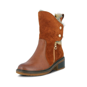 Patrizia Style: Saige Stylish pull-on bootie featuring a foldable wild faux fur cuff with polished metal snap closures and an easy on/off lateral (outside) zipper all on a chunky and sculpted heel. Heel Height (approximately): 2" Platform Height (approximately): 3/4" Back Shaft Height (approximately): 6 3/4" Circumference (approximately): 11" Features: -High quality manmade leather and microsuede upper, round toe silhouette, vegan-friendly materials, tonal stitching. -Full length outside zipper with a polished metal zipper pull. -Polished metal snap closures. -Cozy faux fur lining. -Cozy faux fur insole. -TPR outsole with flexible forefoot. -Imported.