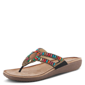 Patrizia Style: TAMORA Trendy thong sandal featuring multicolored wooden barrel beads and rhinestones surrounding a circular (honeycomb) bead on a geometric cut out upper. The soft and cozy foot bed along with the flexible sole assures all day comfort. Upper: Synthetic Lining: Synthetic Insole: Synthetic Outsole: TPR Closure: Slip-on Heel Height: 1.25" Platform Height: 3/4" Features: - Comfort, Embroidered , Flexible Sole, Footbed