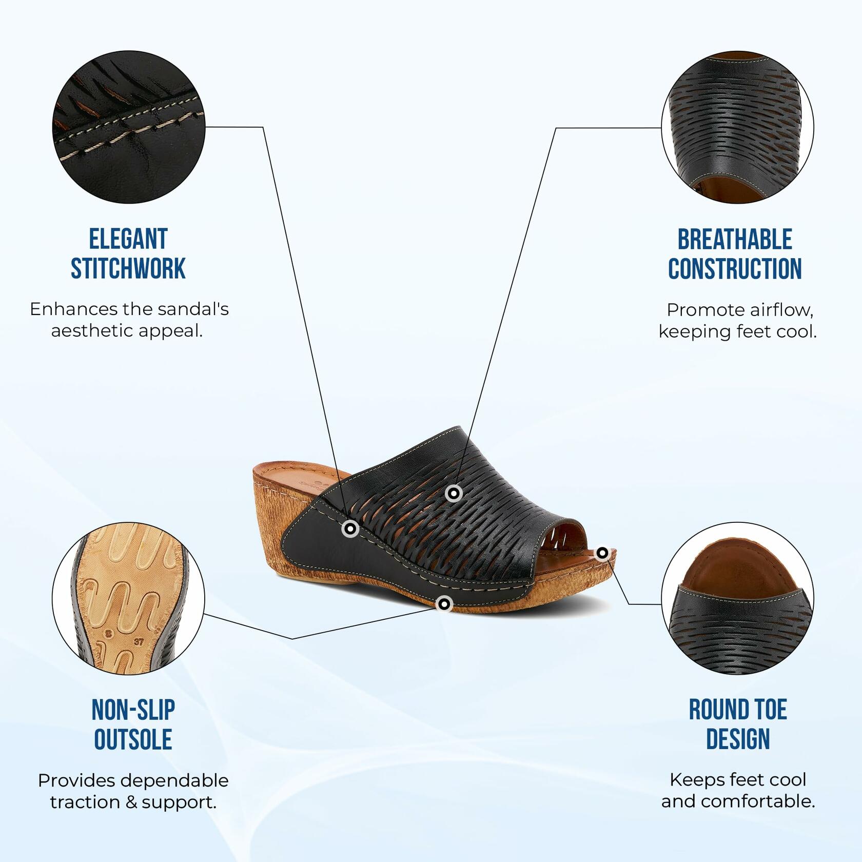 Step into summer with the perfect blend of style, comfort, and quality craftsmanship in the Spring Step Cunacena Sandals. These beautifully designed wedges feature a breathable die-cut leather upper with subtle stretch, allowing them to conform effortlessly to your feet for a truly personalized fit. Whether you're strolling along the beach boardwalk or heading to a weekend brunch, these sandals make it easy to stay cool and comfortable. The cushioned leather insole and soft leather lining offer a premium, friction free feel that supports you with every step. A 2.5 inch wedge heel gives you a gentle lift while maintaining a stable base thanks to the 3/4 inch platform. Perfect for travel, casual wear, or dressing up your summer outfit, these slip-on sandals are as versatile as they are stylish. Handcrafted in Turkey with top-tier leather and a durable polyurethane outsole, the Cunacena is a thoughtful combination of beauty and function. It's your go-to summer sandal, made to move with you from sunrise to sunset. Features: Soft, breathable leather upper with stylish die-cut design Comfortable 2.5"" wedge heel with 3/4"" platform for support Leather lining and cushioned insole for all-day wear Easy slip-on style for everyday convenience Crafted in Turkey with high-quality materials